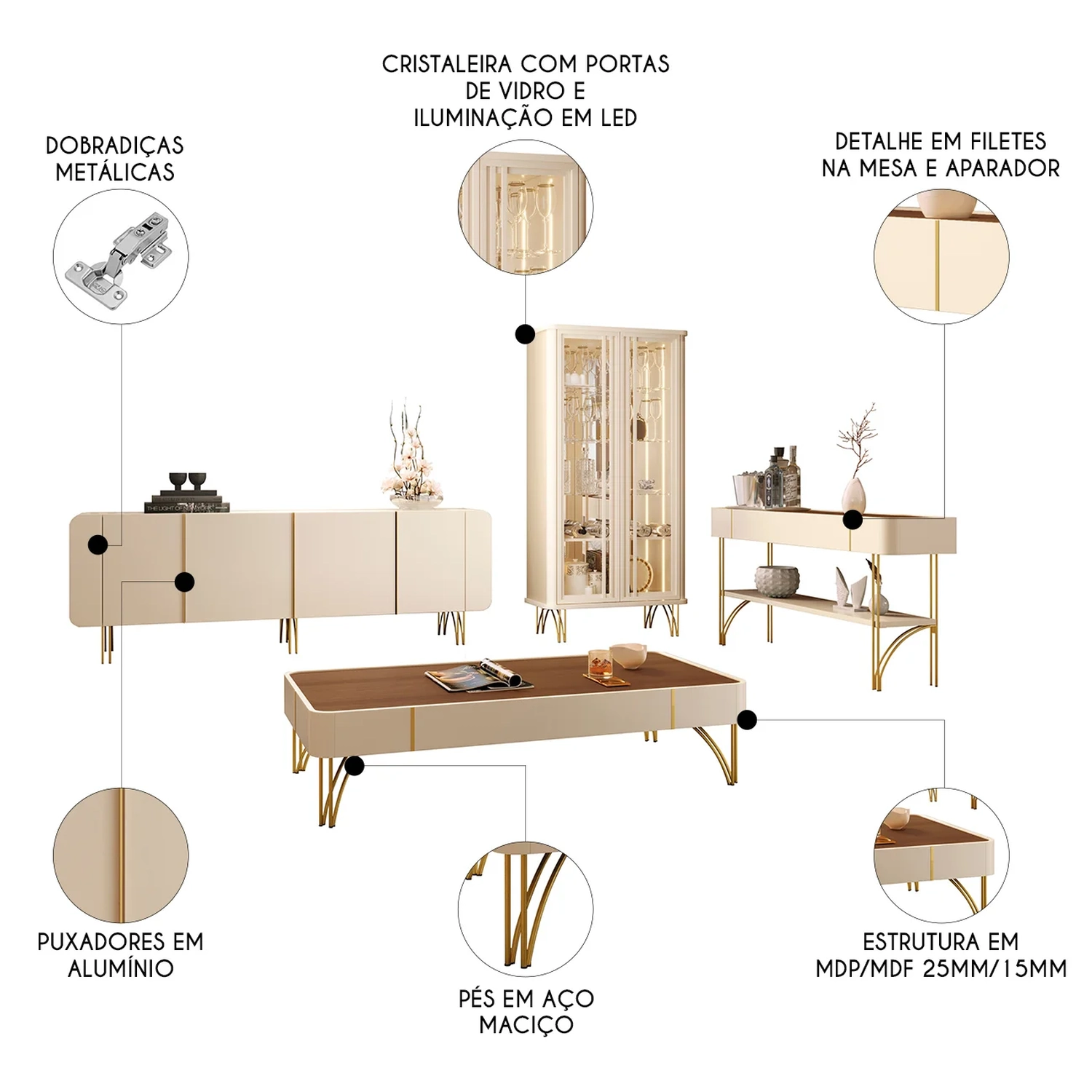 Requinte que traz peças contemporâneas com formas orgânicas e estilo industrial. O conjunto é composto por uma Cristaleira, um Buffet, uma Mesa De Centro e um Aparador, produzidos em MDP e MDF de 15mm e com pés de aço maciço 3/8 com acabamento em tom dourado. A cristaleira tem portas de vidro emolduradas, sistema de abertura fecho toque, iluminação interna com perfil de LED, três prateleiras de vidro 6mm, adega com divisórias para 6 garrafas e espelhos 3mm ao fundo. O buffet tem amplo espaço interno com prateleira para organizar melhor seus itens, quatro portas com dobradiças em aço e sistema de amortecimento para portas, que garante um fechamento suave e silencioso, os puxadores são em alumínio com acabamento dourado. A mesa de centro e o aparador têm filetes laterais decorativos que dão um charme especial às peças. O aparador ainda tem uma prateleira inferior de 25mm que pode ser usada para decorar ou dividir ambientes. Esse conjunto é ideal para quem quer transformar a Sala de Estar em um ambiente elegante, aconchegante e prático.