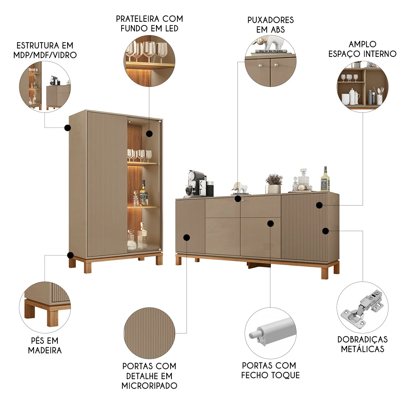 Buffet Aparador e Cristaleira com LED Lucca Areia/Freijó C01 - Mpozenato