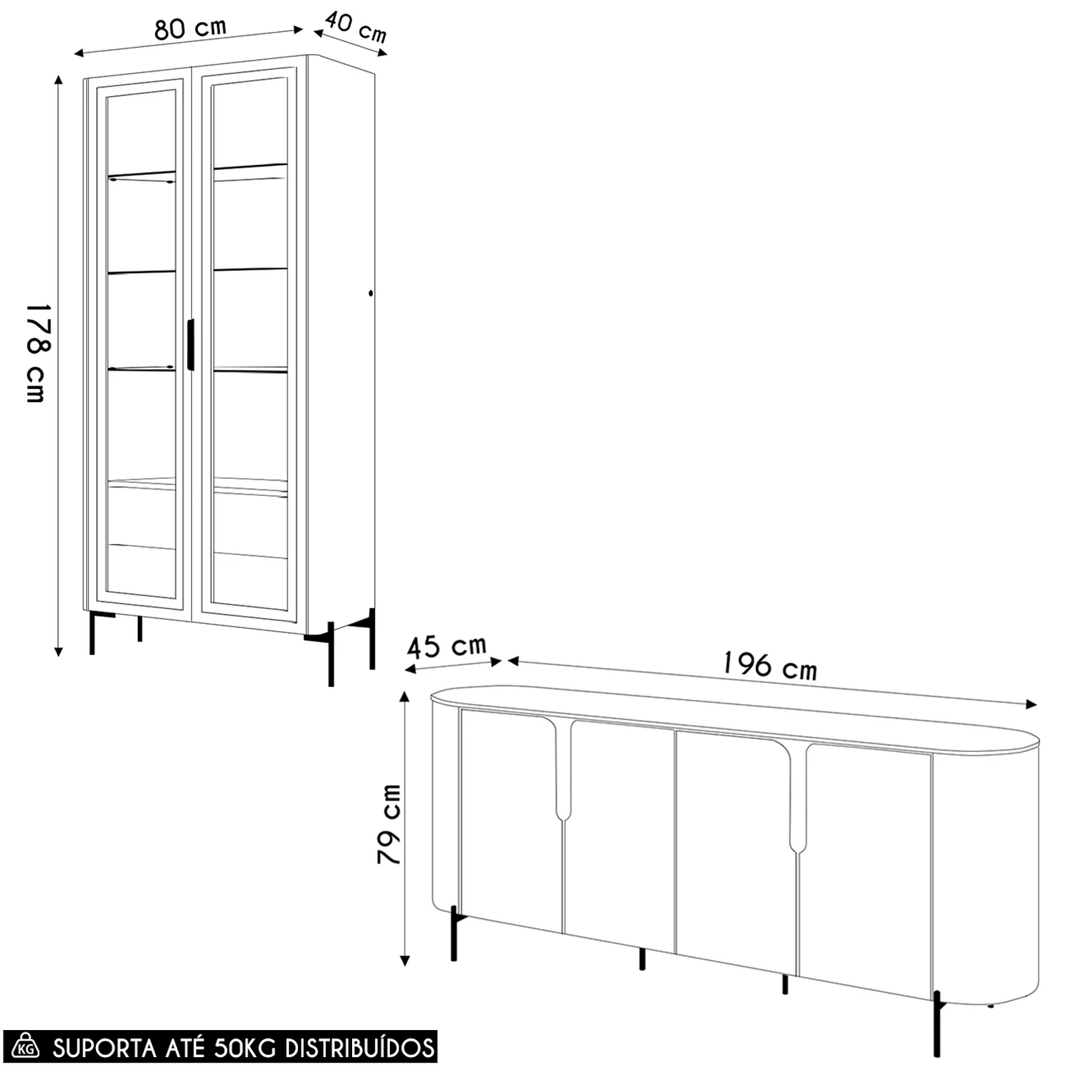 .Peso Suportado Distribuídos: 40 kg Aparador/10 kg Cristaleira.