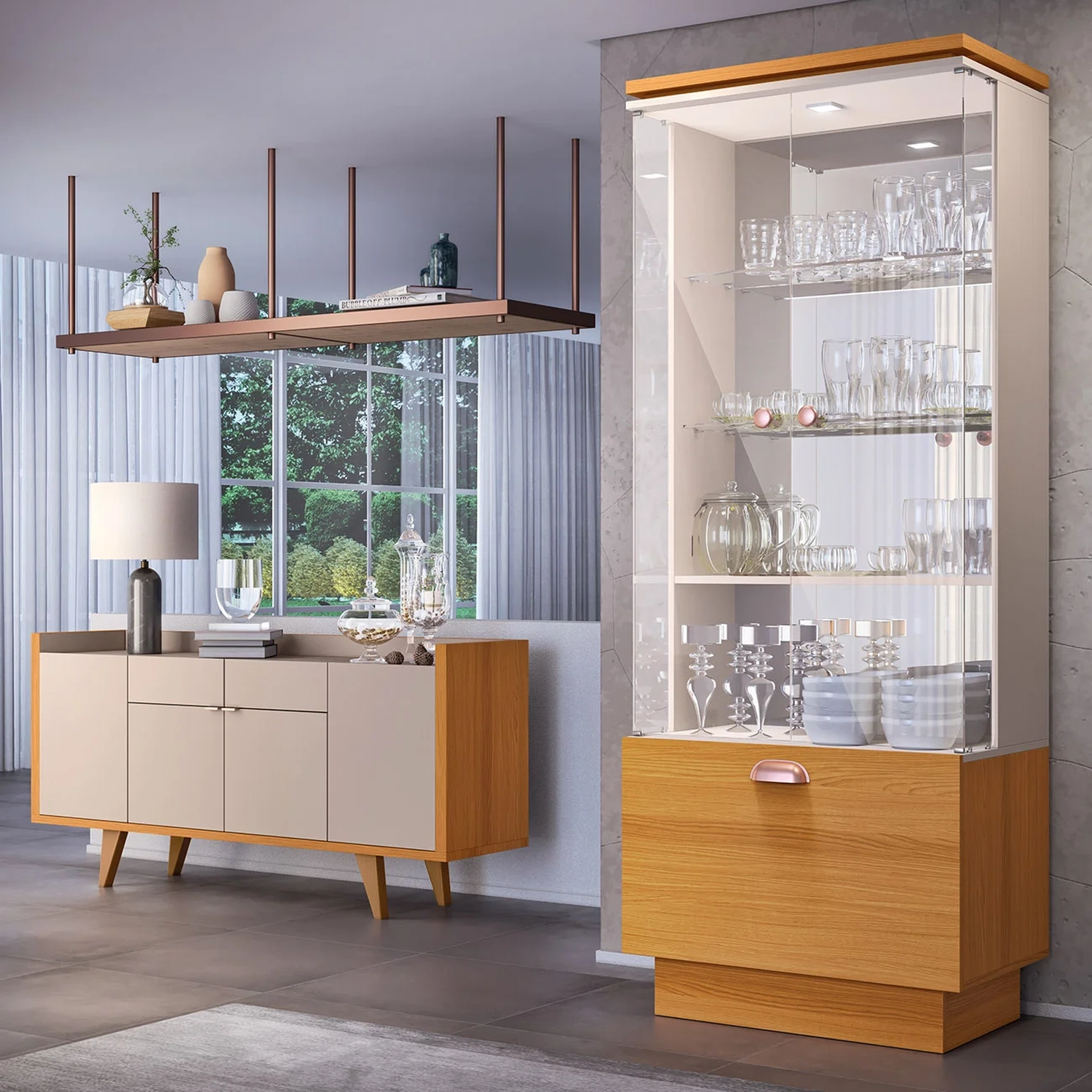 Ideal para dar aquela cara nova na sua Sala de Jantar, o Buffet Aparador Melodia e Cristaleira Aura Off/Cinamomo, da HB Móveis!