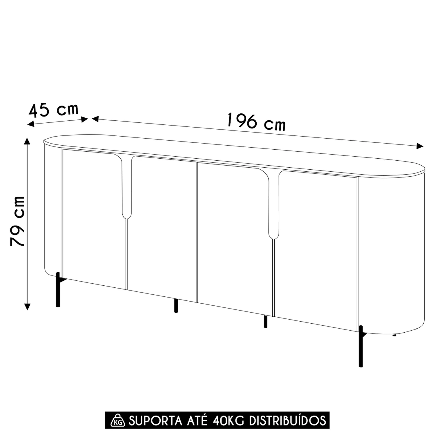 Este Buffet Moderno é marcado pelos cantos arredondados, que conferem leveza e elegância ao móvel. Com seu tampo de 25mm, usinado com bordas arredondadas, ele proporciona um acabamento refinado e de alto padrão. O móvel também é altamente funcional, com quatro portas convencionais em MDF e detalhes usinados, além de duas prateleiras internas que oferecem amplo espaço para organizar objetos e utensílios domésticos. As portas são apoiadas em batentes com pintura PU dourada, harmonizando-se com as bordas do tampo e criando continuidade visual no design do produto. Produzido com materiais de alta qualidade, o Aparador Buffet é reforçado com pés metálicos cilíndricos dourados, que, além de garantir durabilidade, conferem um toque contemporâneo e facilitam a limpeza. Esse conjunto de características faz deste buffet para Sala de Jantar a escolha ideal para deixar seu espaço ainda mais bonito, aconchegante e prático.