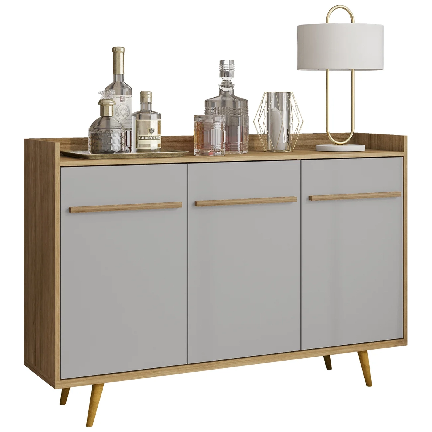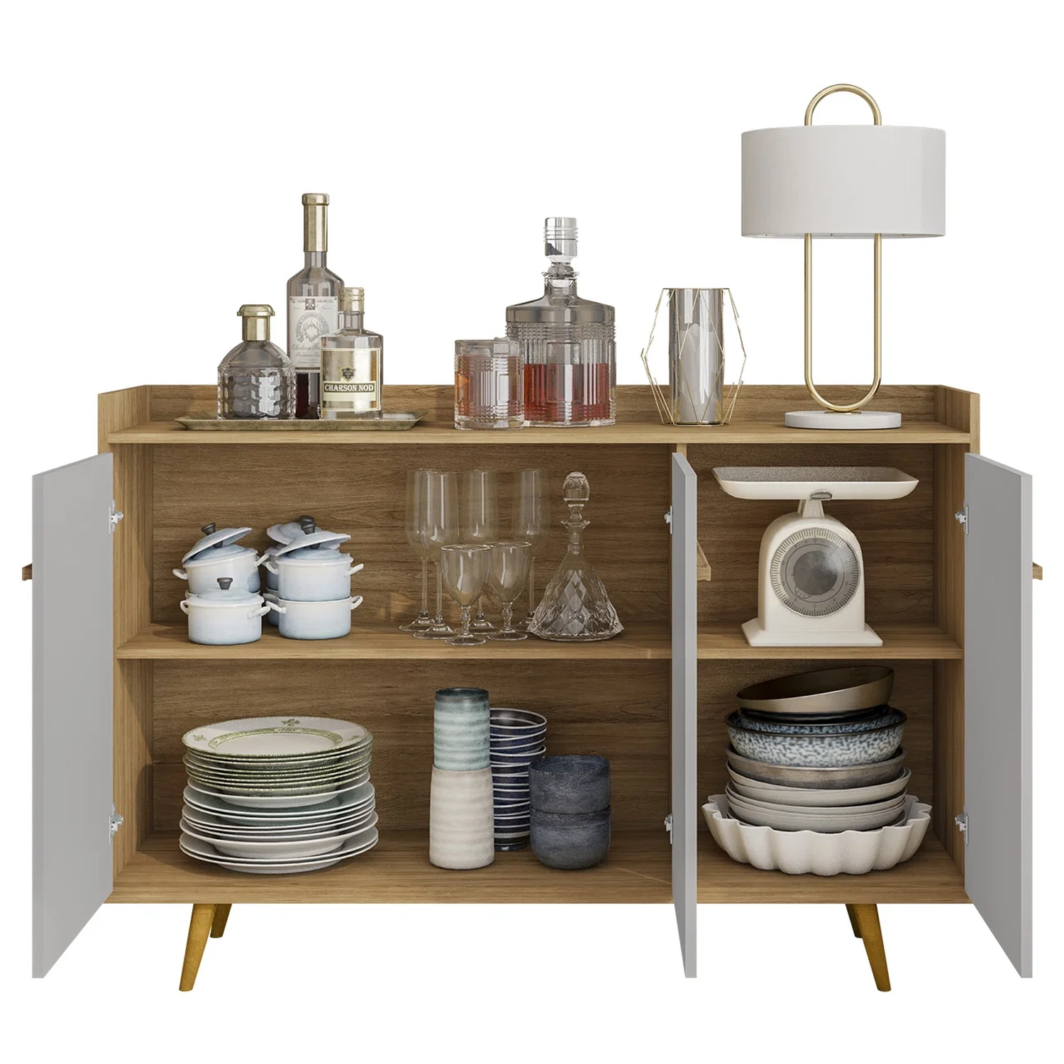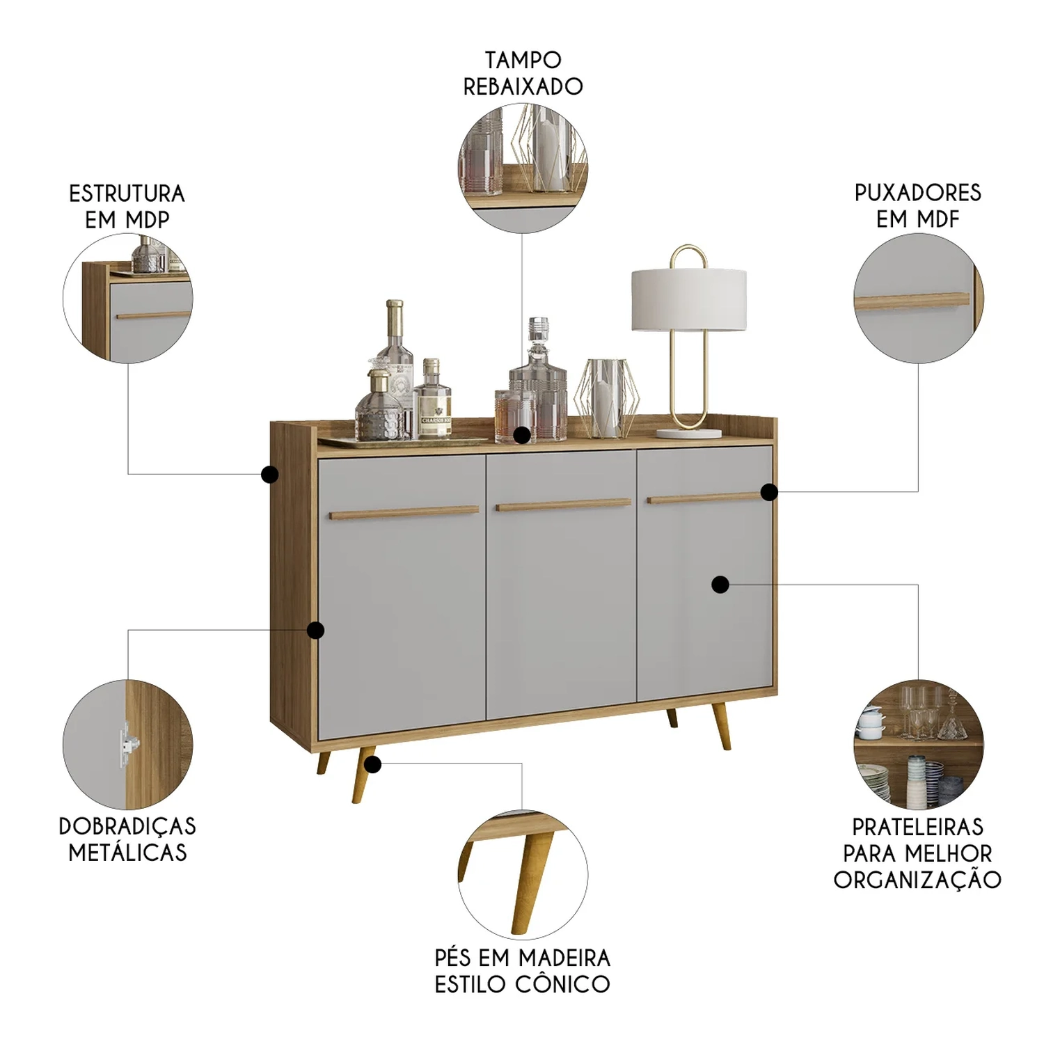 O Balcão Buffet também conta com duas prateleiras internas, sendo uma delas ajustável ou até mesmo removível, permitindo a personalização do espaço. Essa flexibilidade facilita o armazenamento de itens de diferentes tamanhos, sem abrir mão da estética.