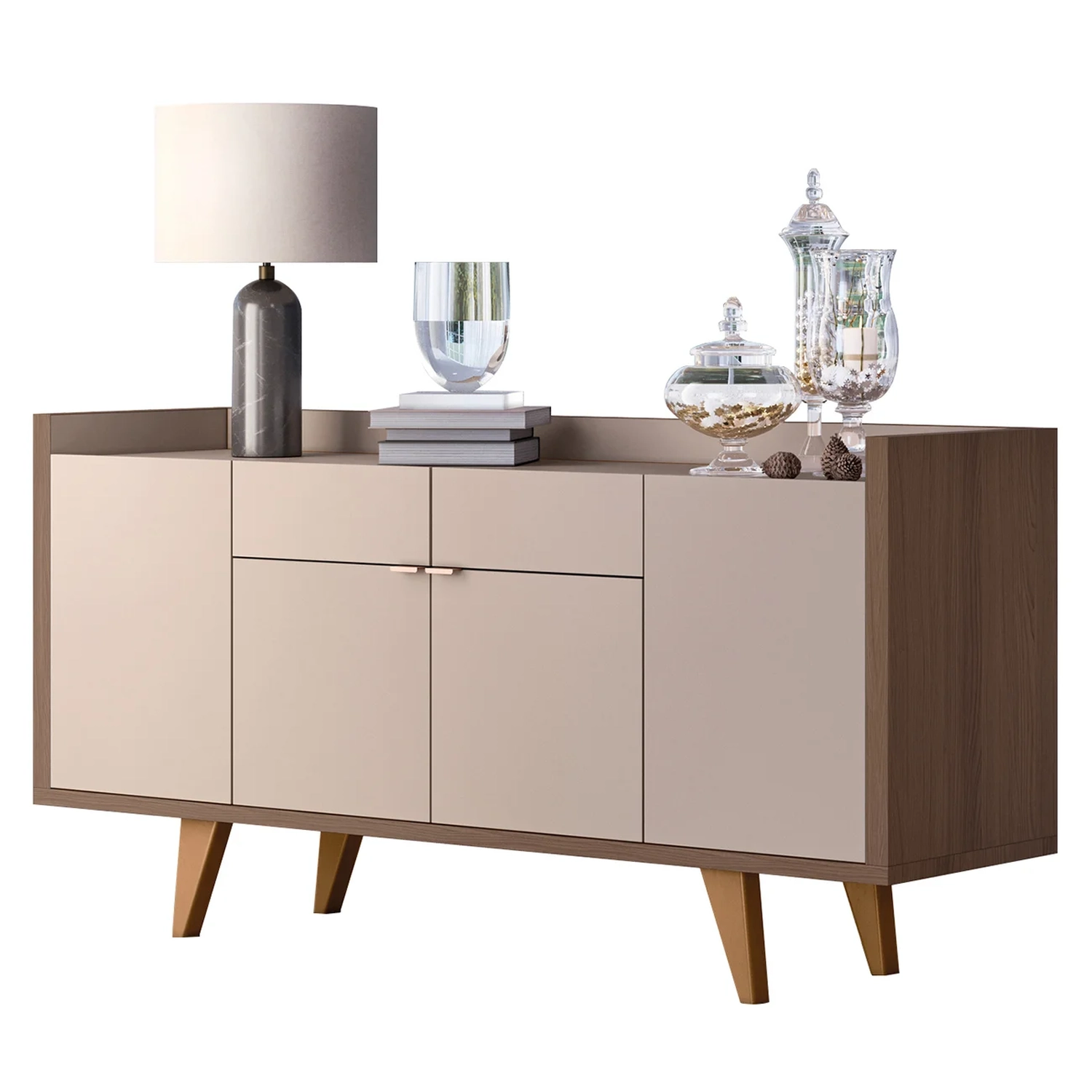 O conjunto de Cristaleira e Buffet combina elegância e praticidade. A Cristaleira possui duas portas de vidro e puxador em poliestireno, uma prateleira de MDP e duas prateleiras de vidro, iluminação LED e fundo espelhado, ampliando e destacando suas taças e louças, além de uma gaveta já com adega para acomodar suas bebidas. Já o Buffet Aparador oferece duas portas com puxadores em alumínio, duas gavetas com corrediças telescópicas. O tampo com bordas laterais, permite que suas decorações e garrafas fiquem mais seguras. Os pés em madeira maciça garantem resistência e estabilidade.