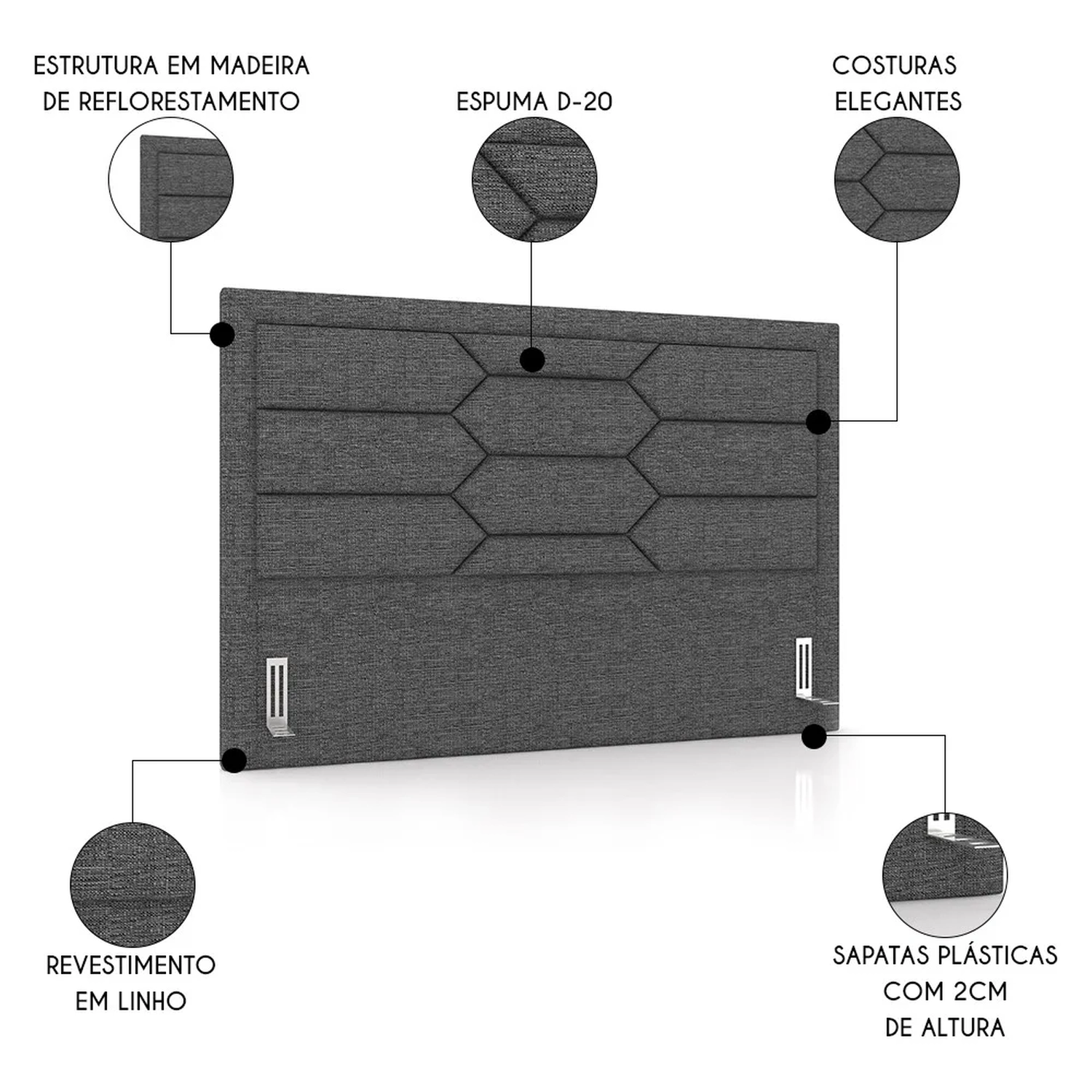 A costura com desenhos únicos, cria um visual charmoso e contemporâneo. Além disso, a estrutura dessa cabeceira estofada proporciona conforto e suporte na medida certa para suas noites de sono. Em outras palavras, essa cabeceira casal oferece durabilidade e resistência, graças aos materiais de alta qualidade da sua composição. Ah, para deixar o seu ambiente ainda mais belo e funcional, basta combinar essa cabeceira com mesas laterais, e você terá um quarto de casal completo, como sempre quis.