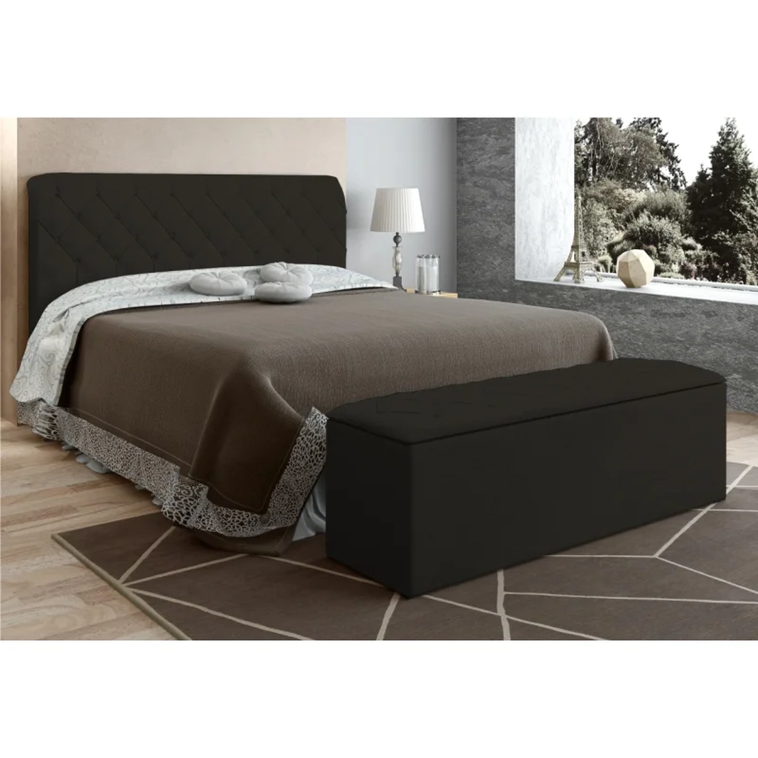 Cabeceira Cama Box Casal Queen 160cm com Calçadeira Baú Paris Veludo Chocolate - JS MóveisCabeceira Cama Box Casal Queen 160cm com Calçadeira Baú Paris Veludo Chocolate - JS Móveis