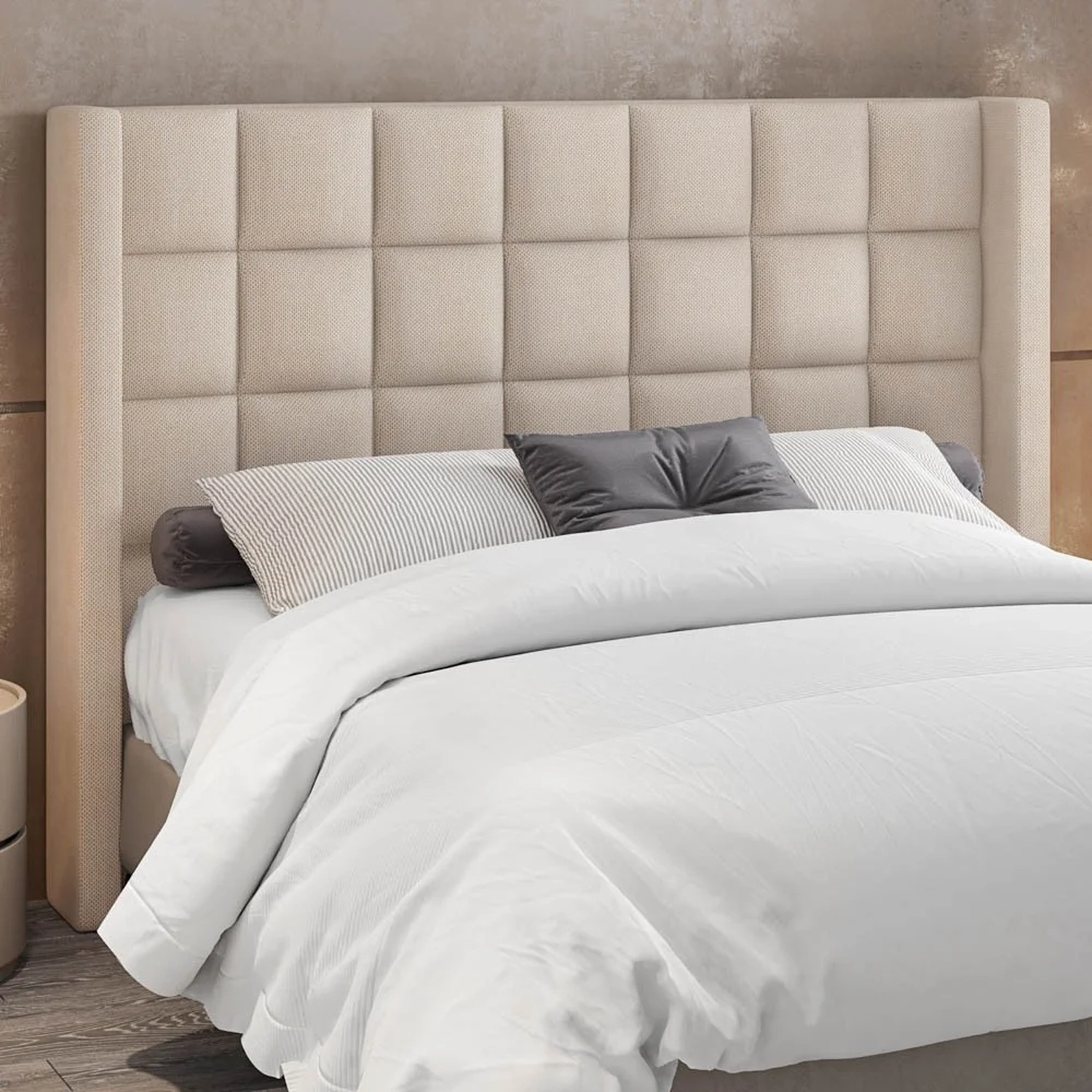 Te apresentamos a Cabeceira Casal Queen Pisa com seu design moderno que remete a Cabeceira Painel com sua costura, no centro, evidenciando as formas geométricas. Só que, ainda conta com um diferencial que são as laterais estofadas revestidas por tecido Linho que além do requinte ainda confere resistência e durabilidade ao produto.