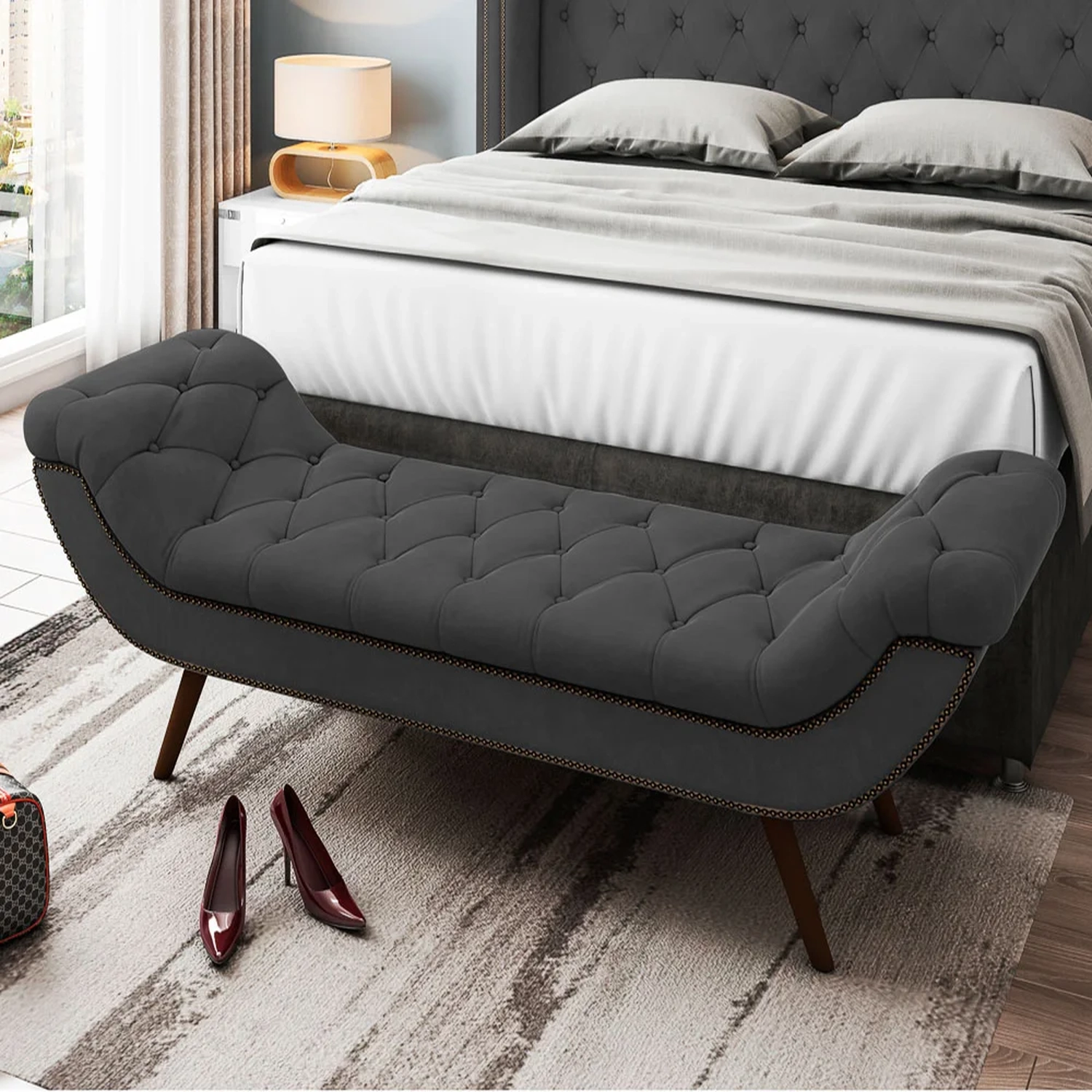 Para agregar ainda mais beleza e funcionalidade, a Calçadeira Recamier Veneto é uma espécie de puff para quarto que tem como finalidade servir de apoio na hora de se arrumar, seja para calçar os sapatos ou se vestir, além de manter a cama posta sempre impecável e o quarto sempre organizado. Já o seu design segue a mesma proposta da cabeceira, deixando o espaço aconchegante e harmonioso. Ahhh e não podemos esquecer da versatilidade, porque além do quarto, é possível dispor essa peça na sala de estar e até mesmo no hall de entrada, aproveitando ao máximo esse produto com soluções criativas para a sua casa.