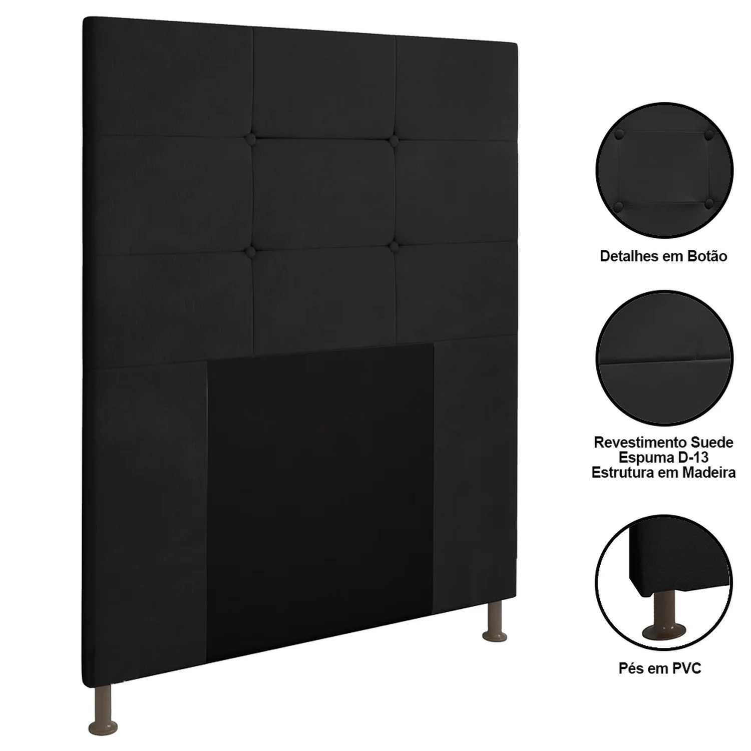 A Cabeceira estofada é mais que um acessório, além de ser uma peça decorativa, você pode encostar confortavelmente para ler um livro ou assistir a tv. Fabricada em Madeira Eucalipto de reflorestamento, a parte estofada é preenchida com espuma de alta qualidade e revestida em tecido Suede, durável, resistente, macio e agradável ao toque. Ah! O design botonê com botões revestidos é o destaque desse produto, pois deixa a peça mais moderna, sem contar que está sempre em alta. Outro detalhe é a borda levemente curva que confere um acabamento mais suave.