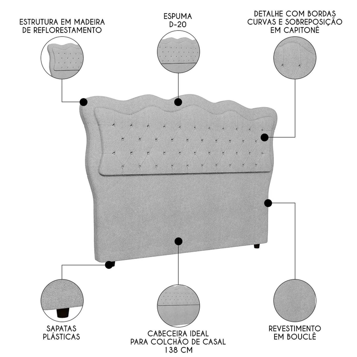 Fabricada com estrutura resistente, tapeçada com espuma D-20 e revestida com tecido de alta qualidade, suave ao toque, essa cabeceira estofada será o ponto alto do seu quarto, pois além do design orgânico representado pelas linhas curvas, ainda se destaca pela sobreposição em capitonê que agrega charme e conforto extra, ao passo que transforma a decoração. Seja para recostar a cabeça durante a leitura ou simplesmente para apoiar as costas enquanto descansa, o fato é que a cabeceira Oregon é a peça perfeita para tudo isso e muito mais.