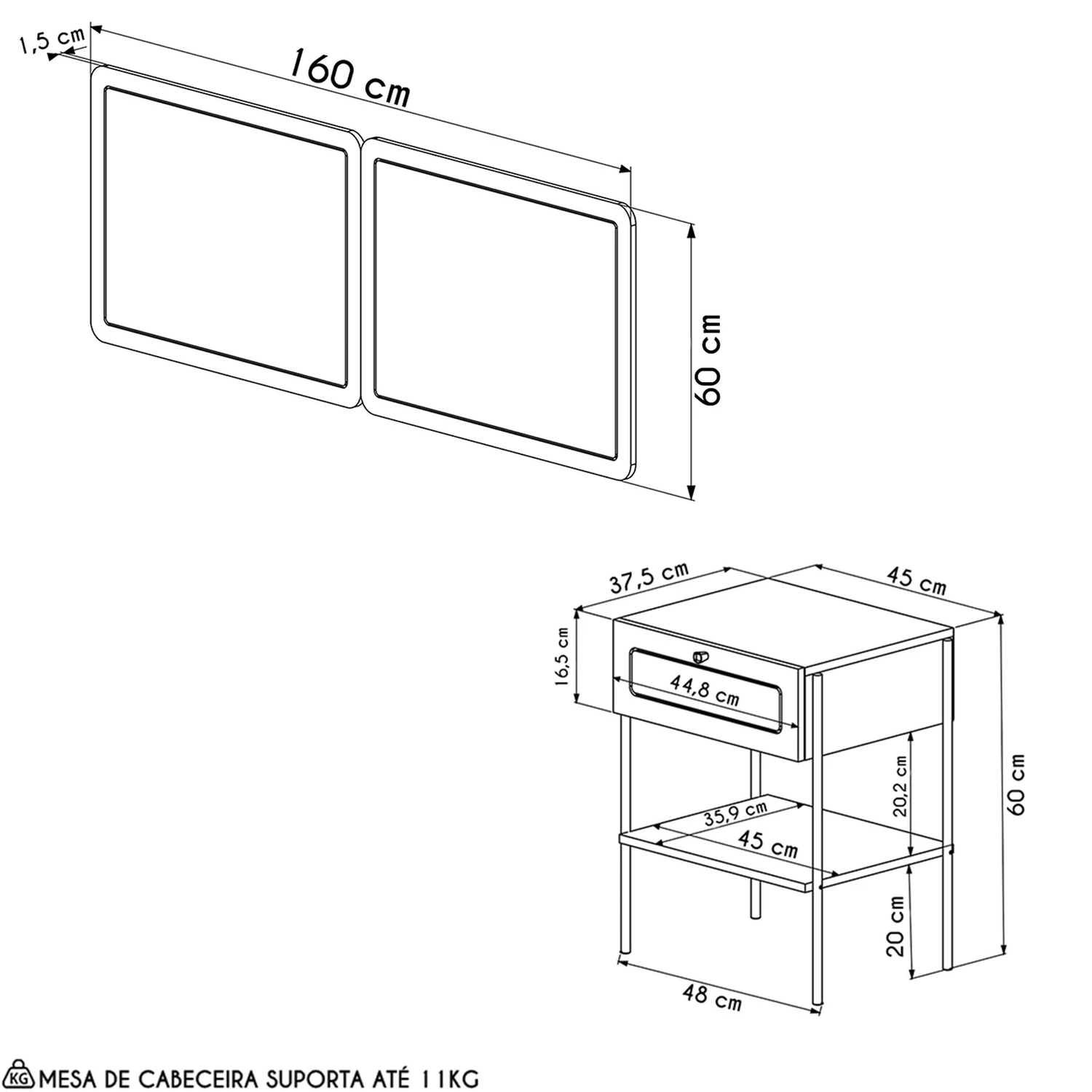 Cabeceira: 160 x 60 x 1,5 cm.