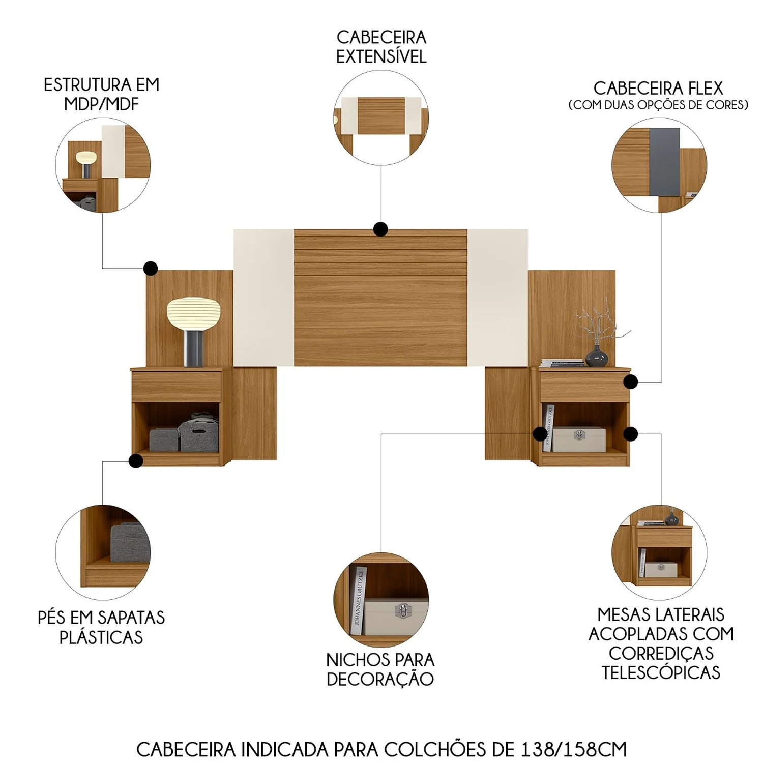 Transforme seu Quarto em um verdadeiro refúgio de descanso e tranquilidade com a Cabeceira Casal Extensível e Mesas Cany Flex Z17 Off/Cinza/Freijó, da Mpozenato, que foi projetada para tornar seu ambiente ainda mais aconchegante e funcional.