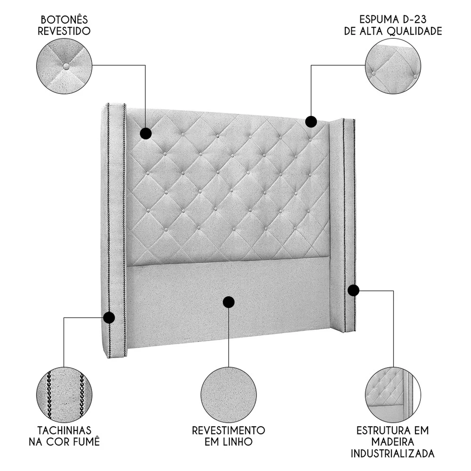 Com sua estrutura feita de madeira industrializada, espuma D23, e os frames para fixação na cama ela proporciona um suporte firme e confortável. O revestimento em linho da Cabeceira Capitonê adiciona uma textura rica e sofisticada, enquanto os detalhes em tachinhas nas laterais criam um visual clássico e atemporal. Não só serve como um ponto focal estético, mas também como uma promessa de conforto e beleza duradouros. O design da Cabeceira Estofada é pensado para complementar a decoração do quarto, adicionando um charme especial que remete à grandiosidade e ao luxo dos tempos antigos.