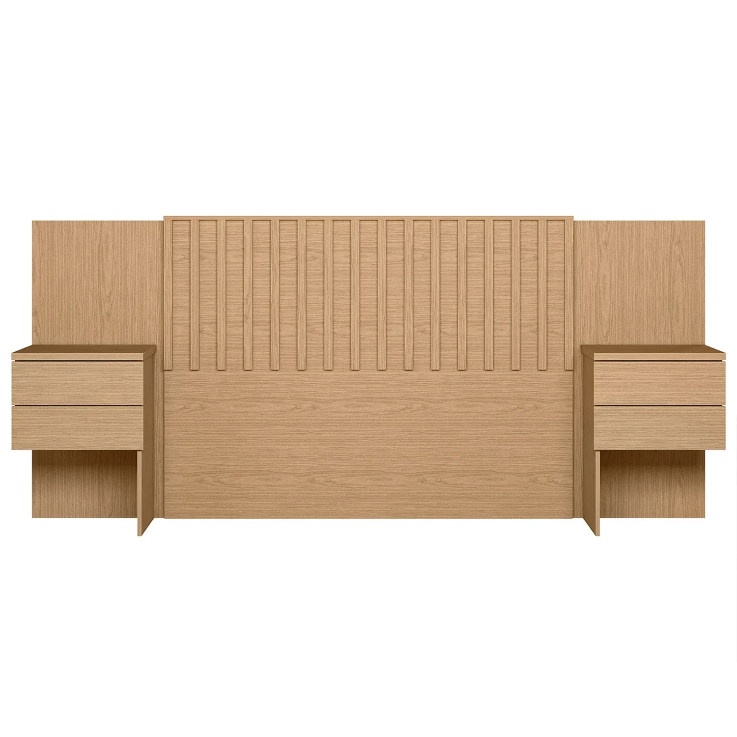 Com uma abertura interna de até 2,10 metros, garantindo um ajuste perfeito. Seu design moderno e sofisticado é complementado por um painel central com acabamento ripado, que agrega um toque de elegância e personalidade ao Quarto do Casal. Para completar a funcionalidade, conta com mesas laterais, cada uma tendo 2 gavetas com corrediças telescópicas, proporcionando fácil acesso e organização para seus pertences. As gavetas são ideais para guardar objetos pessoais, ou outros itens essenciais, mantendo seu quarto sempre arrumado. Com um design integrado e prático, a Cabeceira Extensível combina estética e praticidade, trazendo mais conforto e organização ao seu ambiente.