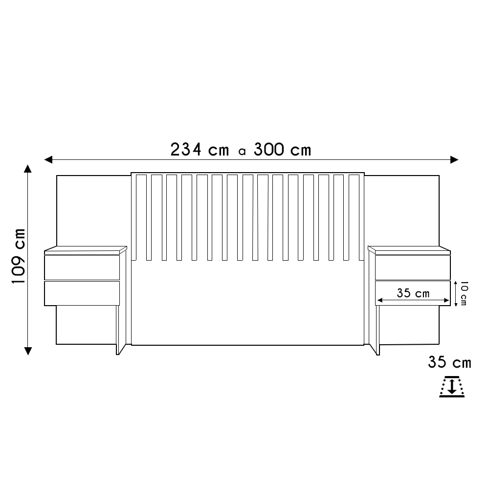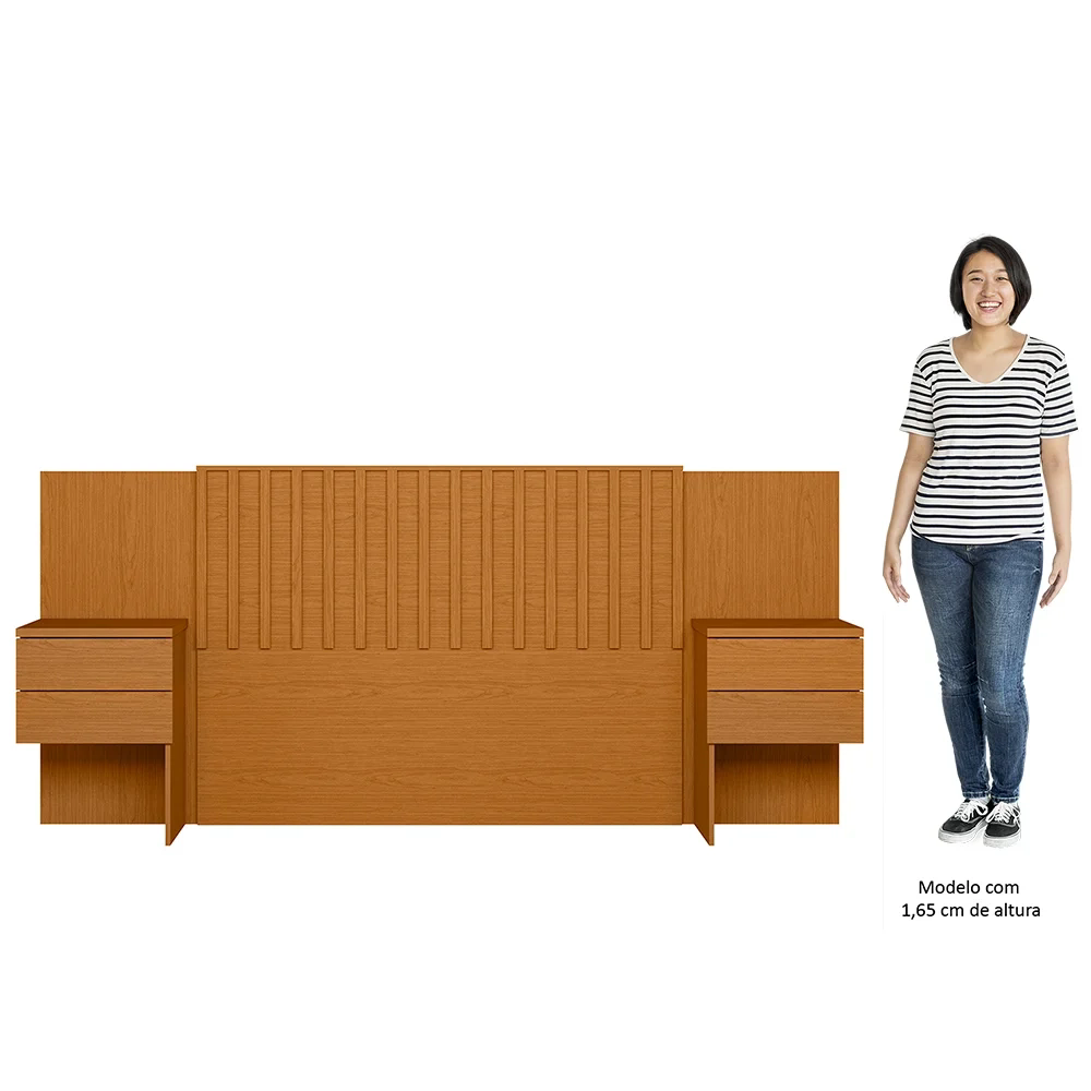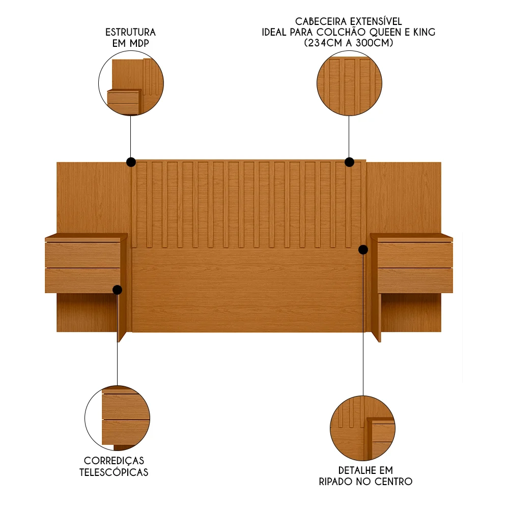 Com largura mínima de 234cm e máxima de 300cm, essa cabeceira ripada pode servir de complemento para cama casal (138cm), cama queen (158cm) e cama king (193cm), pois possui abertura central de até 210 cm para encaixar perfeitamente a sua cama. Além disso, ainda conta com duas mesas laterais que completam a funcionalidade ao permitir que você guarde seus pertences pessoais, mantendo-os organizados e ao alcance das mãos.
