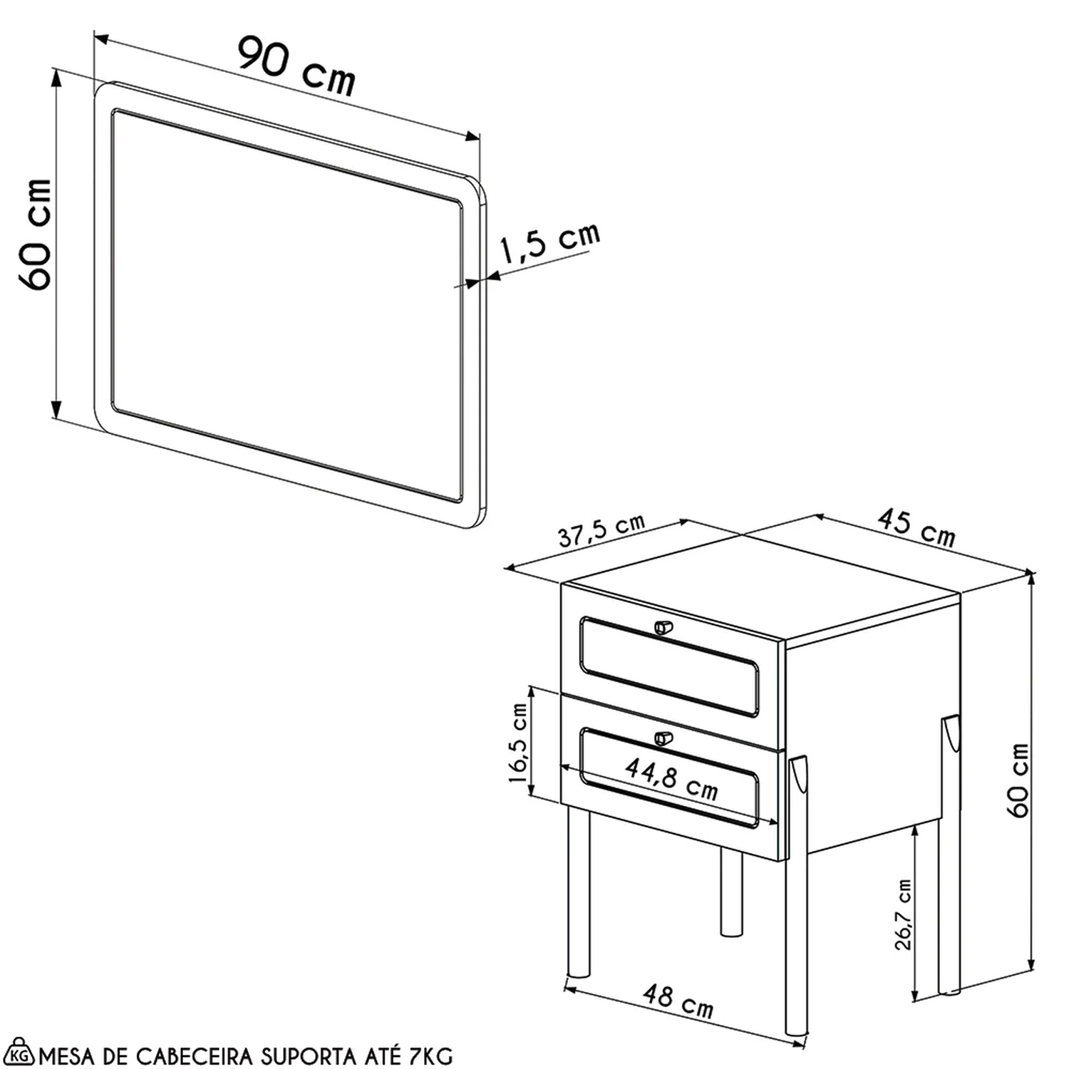 Mesa de Cabeceira: 48 x 60 x 37,5 cm.