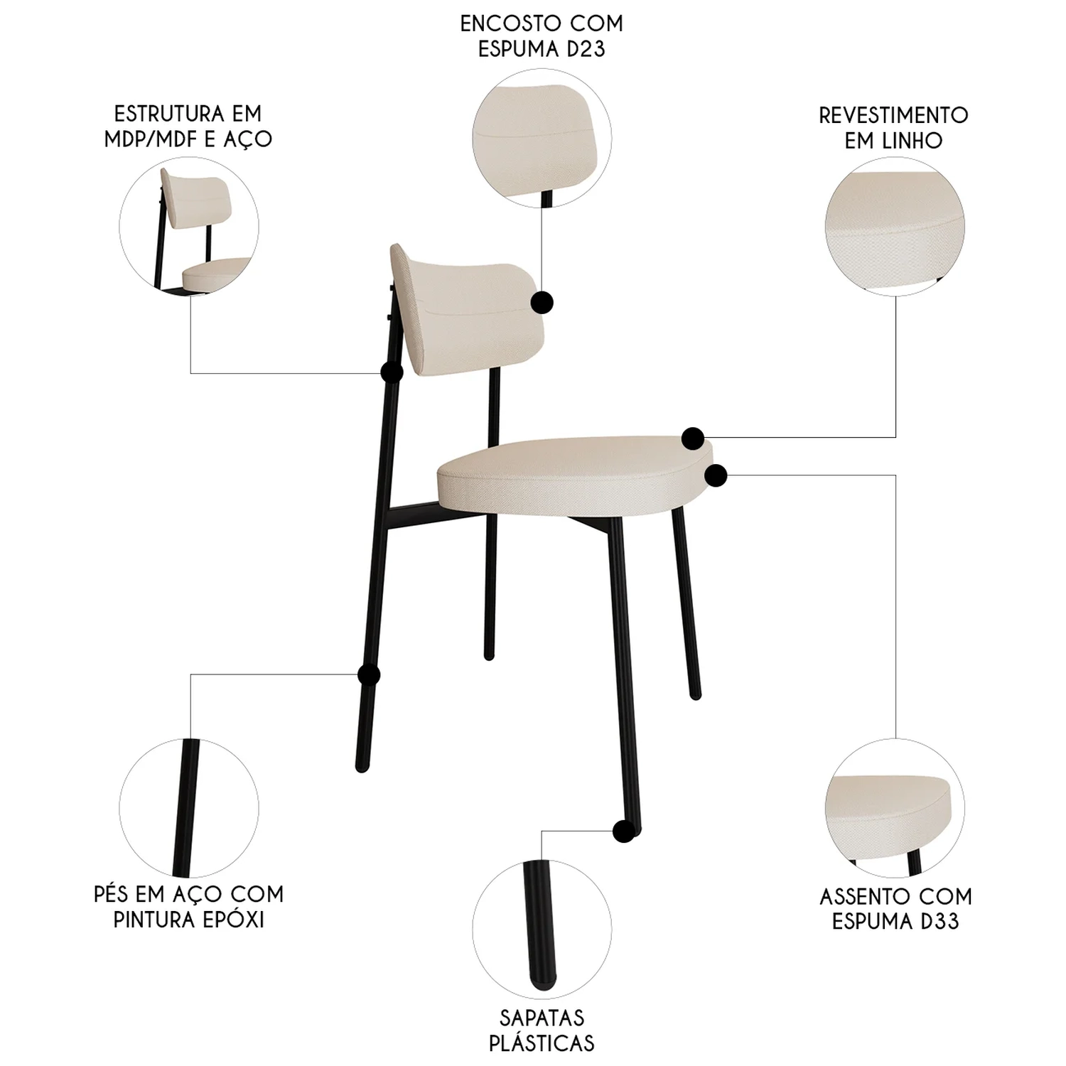O revestimento em linho de alta qualidade confere um toque de suavidade e sofisticação, enquanto o MDF/MDP no assento e encosto garante resistência e durabilidade ao produto. Projetada para oferecer o suporte necessário, possui assento em espuma D33 e encosto em espuma D23, proporcionando uma experiência ergonômica e confortável. Além de sua funcionalidade, o kit de Cadeiras Estofadas se destaca pelo design moderno e elegante, capaz de se adaptar a diversos ambientes da sua casa. Os pés fixos em aço com pintura epóxi na cor preta trazem estabilidade. Seja no Escritório, na Sala de Jantar ou até mesmo em um canto de leitura, ela se encaixa perfeitamente em qualquer ambiente. Seu encosto curvo não apenas proporciona conforto, mas também transforma o ambiente onde está inserida, conferindo um toque mais moderno aos seus espaços.