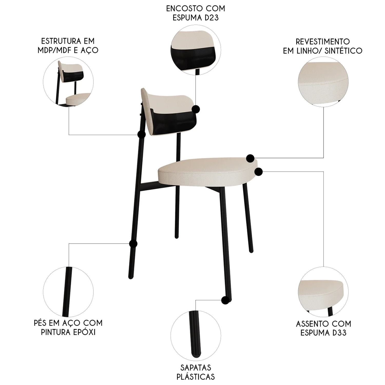 O revestimento em linho com detalhes em sintético de alta qualidade confere um toque de suavidade e sofisticação, enquanto o MDF/MDP no assento e encosto garante resistência e durabilidade ao produto. Projetada para oferecer o suporte necessário, possui assento em espuma D33 e encosto em espuma D23, proporcionando uma experiência ergonômica e confortável. Além de sua funcionalidade, o kit de Cadeiras Estofadas se destaca pelo design moderno e elegante, capaz de se adaptar a diversos ambientes da sua casa. Os pés fixos em aço com pintura epóxi na cor preta trazem estabilidade. Seja no Escritório, na Sala de Jantar ou até mesmo em um canto de leitura, ela se encaixa perfeitamente em qualquer ambiente. Seu encosto curvo não apenas proporciona conforto, mas também transforma o ambiente onde está inserida, conferindo um toque mais moderno aos seus espaços.
