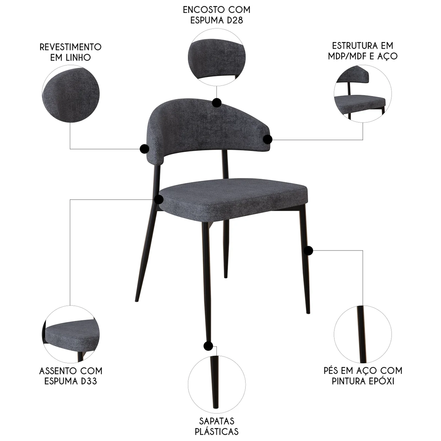 Adaptação e versatilidade são as principais características desse conjunto de cadeiras, permitindo que seja utilizado em Sala de Jantar, restaurantes ou Escritório, ajustando-se perfeitamente a diferentes espaços. O encosto anatômico oferece conforto e suporte, proporcionando uma experiência agradável, enquanto a estrutura em aço com pintura epóxi garante durabilidade e resistência ao longo do tempo. O revestimento em linho lautrec, além de esteticamente sofisticado, é fácil de manter, enquanto o assento com espuma D33 oferece maciez e firmeza. O encosto, com espuma D28, combina conforto e estabilidade. Produzida com MDF/MDP no assento e encosto, o kit de Cadeira Estofada alia design moderno e materiais de alta qualidade para proporcionar uma experiência de uso duradoura e confortável.