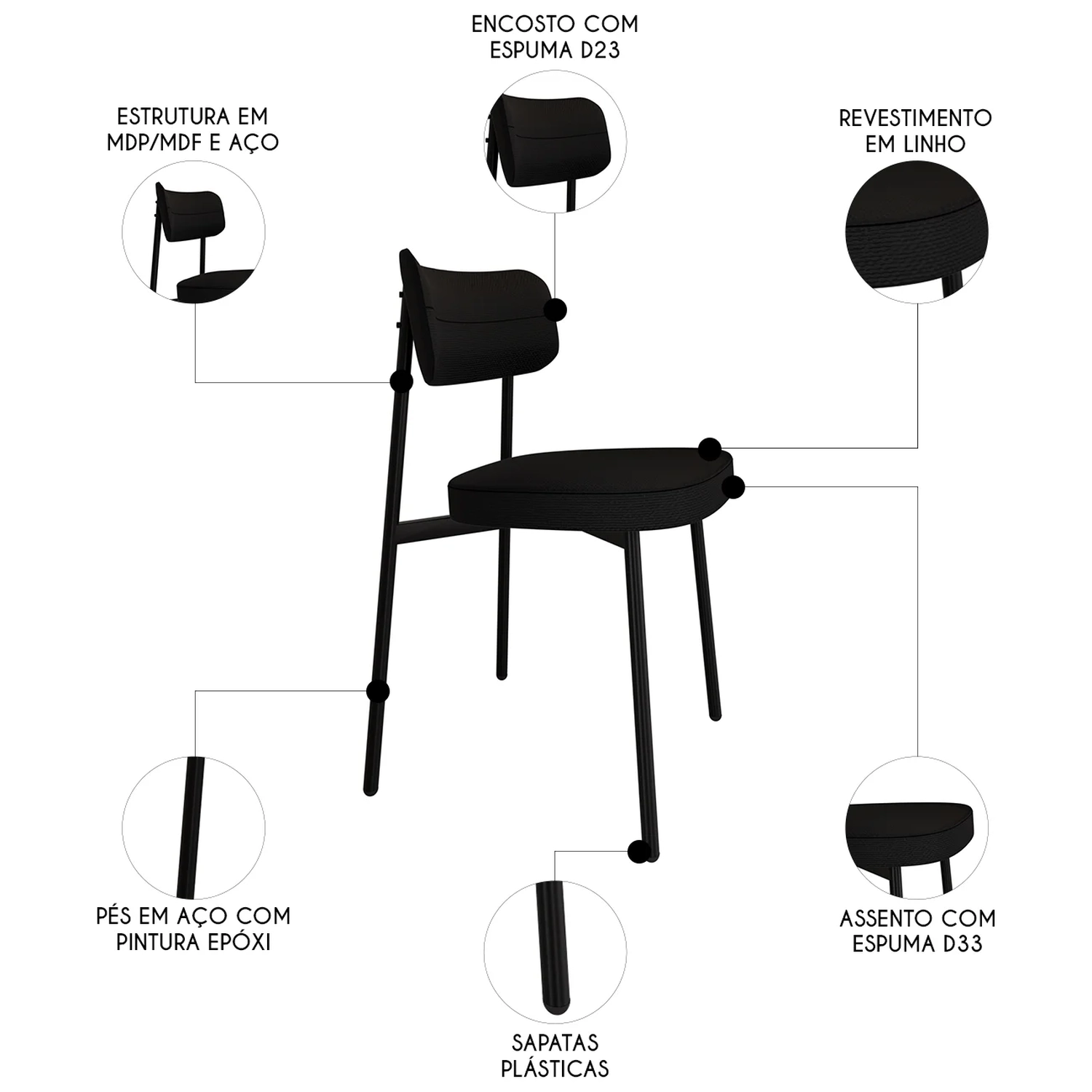 O revestimento em linho de alta qualidade confere um toque de suavidade e sofisticação, enquanto o MDF/MDP no assento e encosto garante resistência e durabilidade ao produto. Projetada para oferecer o suporte necessário, possui assento em espuma D33 e encosto em espuma D23, proporcionando uma experiência ergonômica e confortável. Além de sua funcionalidade, o kit de Cadeiras Estofadas se destaca pelo design moderno e elegante, capaz de se adaptar a diversos ambientes da sua casa. Os pés fixos em aço com pintura epóxi na cor preta trazem estabilidade. Seja no Escritório, na Sala de Jantar ou até mesmo em um canto de leitura, ela se encaixa perfeitamente em qualquer ambiente. Seu encosto curvo não apenas proporciona conforto, mas também transforma o ambiente onde está inserida, conferindo um toque mais moderno aos seus espaços.