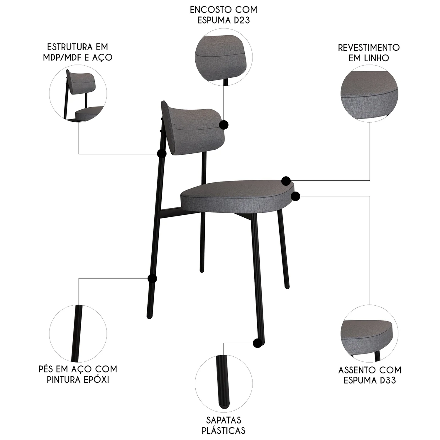O revestimento em linho de alta qualidade confere um toque de suavidade e sofisticação, enquanto o MDF/MDP no assento e encosto garante resistência e durabilidade ao produto. Projetada para oferecer o suporte necessário, possui assento em espuma D33 e encosto em espuma D23, proporcionando uma experiência ergonômica e confortável. Além de sua funcionalidade, o kit de Cadeiras Estofadas se destaca pelo design moderno e elegante, capaz de se adaptar a diversos ambientes da sua casa. Os pés fixos em aço com pintura epóxi na cor preta trazem estabilidade. Seja no Escritório, na Sala de Jantar ou até mesmo em um canto de leitura, ela se encaixa perfeitamente em qualquer ambiente. Seu encosto curvo não apenas proporciona conforto, mas também transforma o ambiente onde está inserida, conferindo um toque mais moderno aos seus espaços.