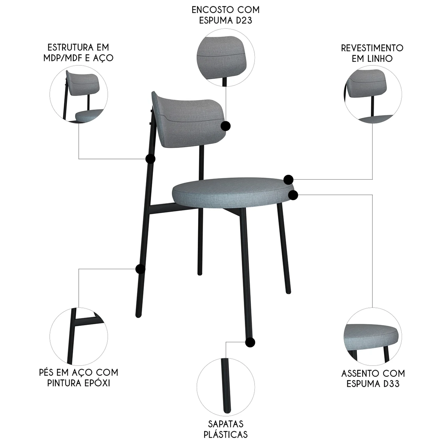 A estética refinada e a capacidade de adaptação a diferentes espaços são pontos chave do kit de Cadeiras Estofadas, que a tornam ideal para Sala de Jantar, restaurantes ou ambientes de escritório. O encosto anatômico oferece excelente conforto e suporte, enquanto sua estrutura robusta em aço com pintura epóxi assegura durabilidade e resistência. O revestimento em linho confere um toque de sofisticação e conforto, enquanto o assento com espuma D33, e o encosto com espuma D23, proporcionam um toque macio, garantindo um bom equilíbrio entre conforto e firmeza. Além disso, a utilização de MDF/MDP tanto no assento quanto no encosto da Cadeira garante uma base sólida e estável, completando o conjunto de características que fazem desta cadeira uma excelente escolha para quem busca qualidade, funcionalidade e estilo.