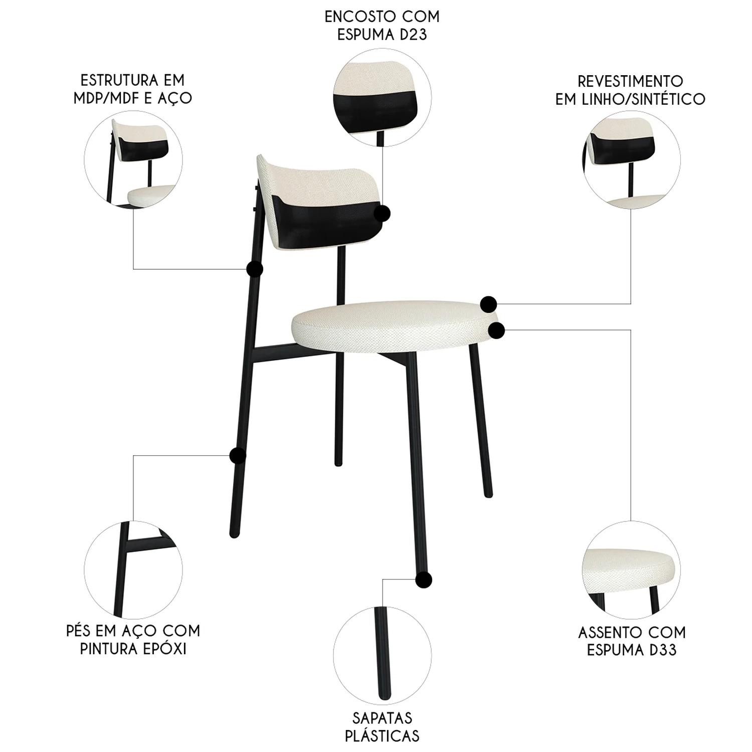 A estética refinada e a capacidade de adaptação a diferentes espaços são pontos chave do kit de Cadeiras Estofadas, que a tornam ideal para Sala de Jantar, restaurantes ou ambientes de escritório. O encosto anatômico oferece excelente conforto e suporte, enquanto sua estrutura robusta em aço com pintura epóxi assegura durabilidade e resistência. O revestimento em linho com detalhe em sintético confere um toque de sofisticação e conforto, enquanto o assento com espuma D33, e o encosto com espuma D23, proporcionam um toque macio, garantindo um bom equilíbrio entre conforto e firmeza. Além disso, a utilização de MDF/MDP tanto no assento quanto no encosto da Cadeira garante uma base sólida e estável, completando o conjunto de características que fazem desta cadeira uma excelente escolha para quem busca qualidade, funcionalidade e estilo.