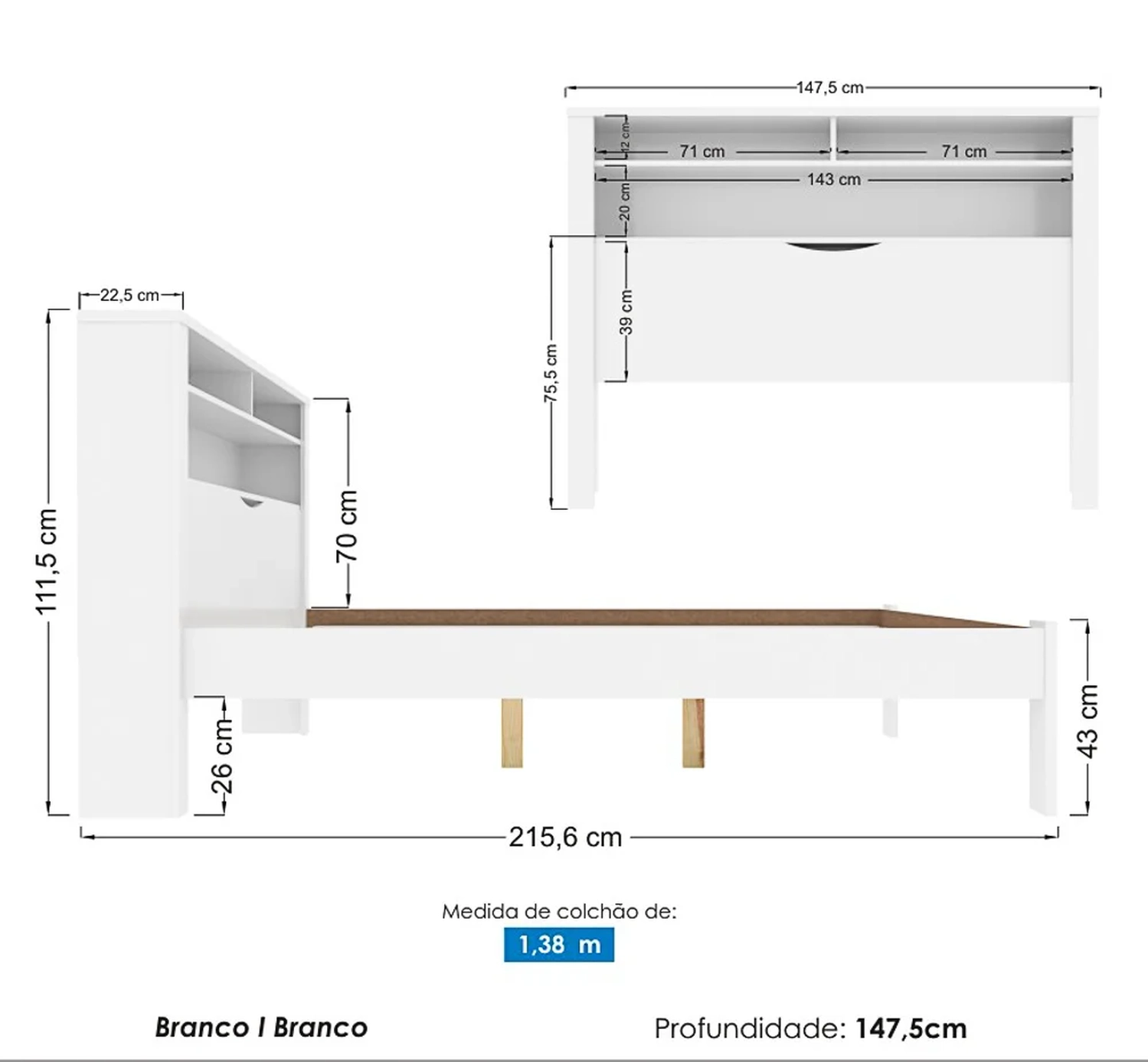 - Cabeceira com prateleira e amplo báu.