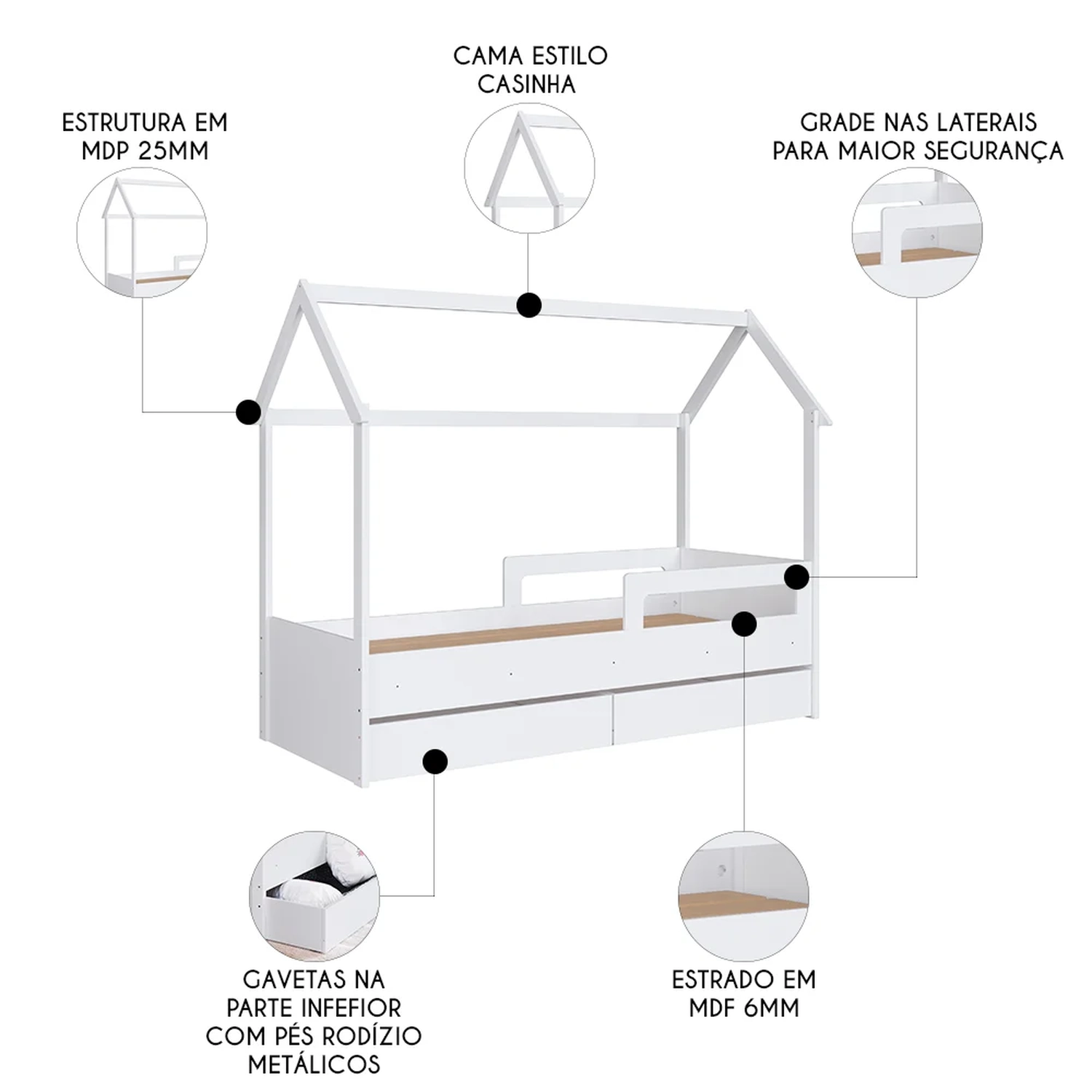 A Cama Infantil Casinha Com 2 Gavetas Infix C06 Branco, da Mpozenato, é perfeita para quem procura unir funcionalidade e diversão no Quarto Infantil.