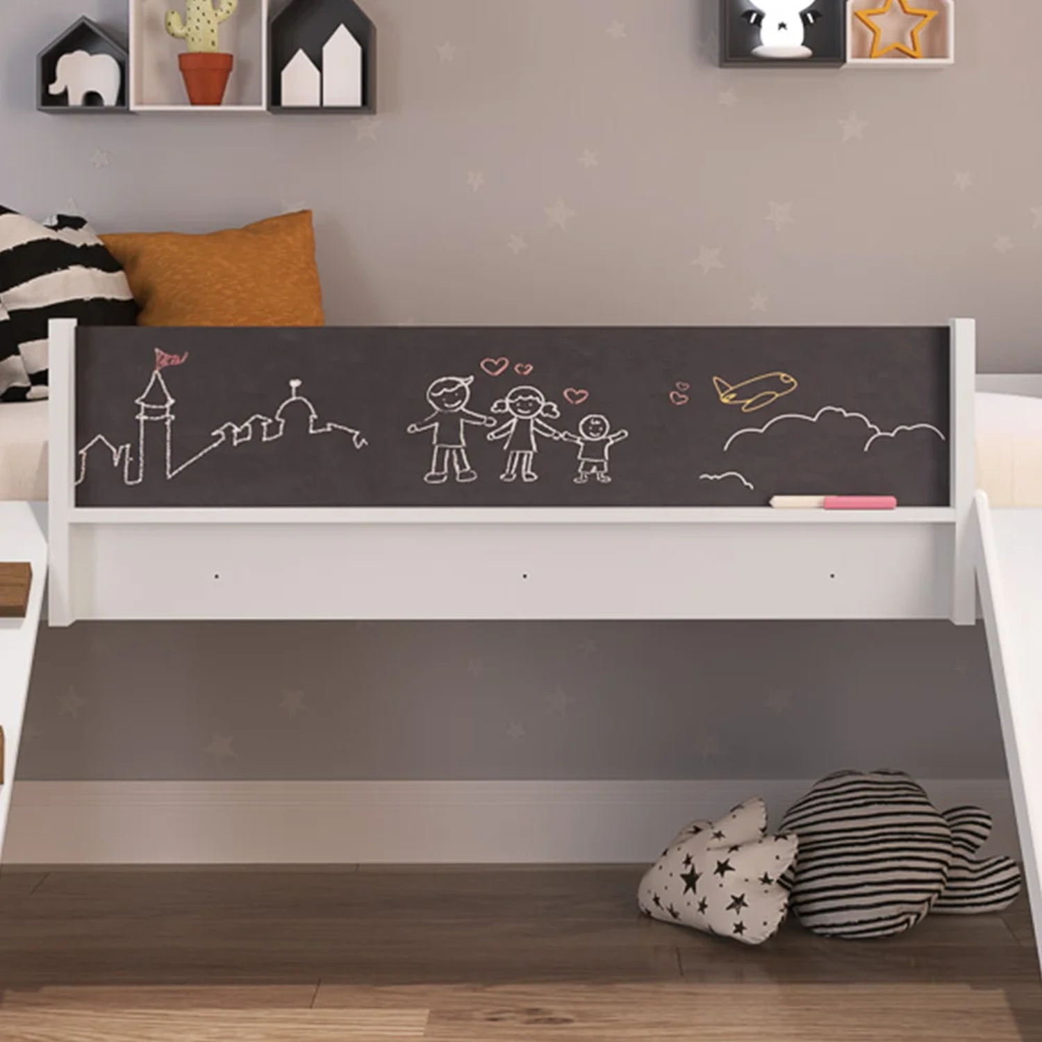 Ela é uma cama infantil com escada na lateral e escorregador do outro lado, ou seja, duas formas diferentes de subir e descer da cama que com certeza podem virar brincadeira. Mas não é somente isso! Essa Cama infantil com escorregador possui espaço suficiente na parte inferior para brinquedos, otimizando o cômodo e contribuindo para a organização. Mas o diferencial mesmo é a lousa no centro que acompanha giz! Perfeito para seu pequeno desenhar, escrever e criar as mais divertidas possibilidades. Tudo fabricado em MDP com acabamento em pintura BP de qualidade e design exclusivo.