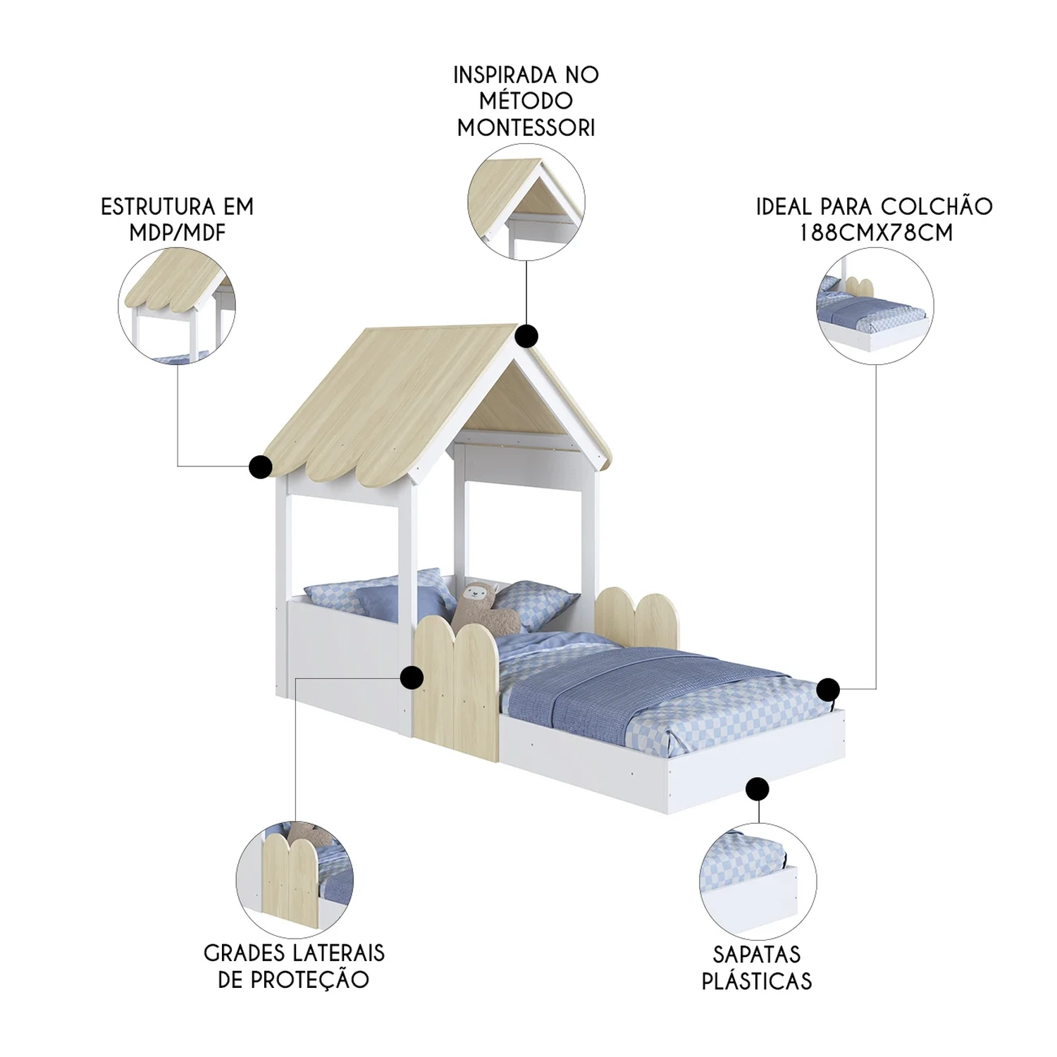 Cama Solteiro Infantil Montessoriana Casinha Nana Branco/Carvalho C06