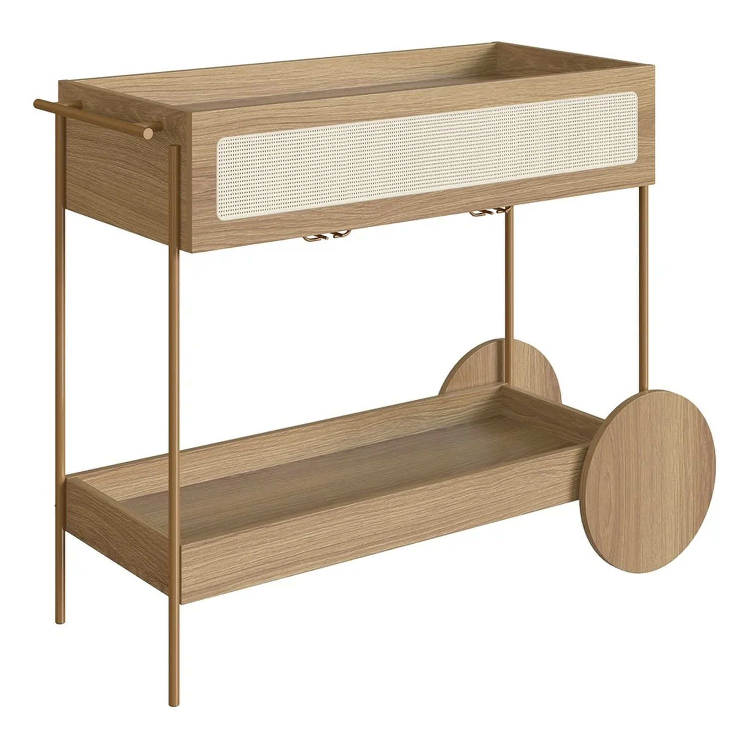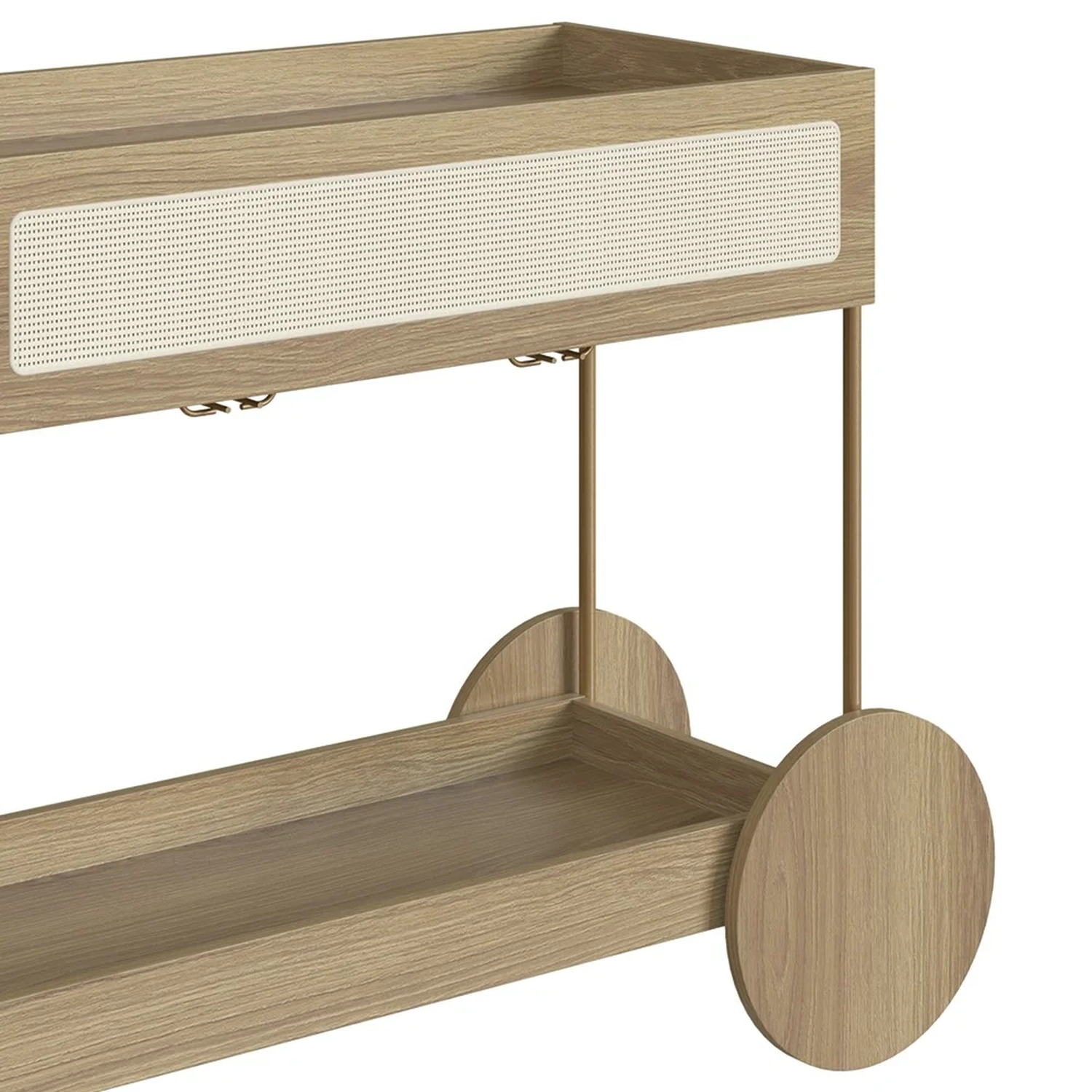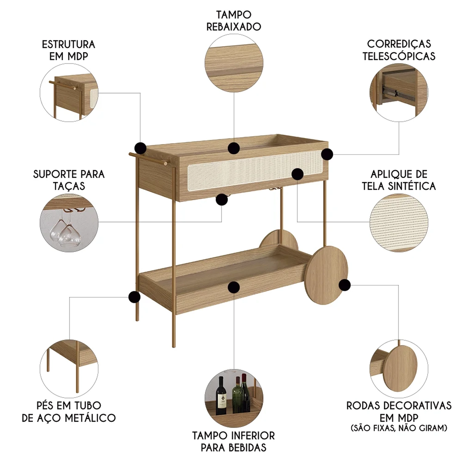 Com sua estrutura em MDP de 15mm e acabamento em BP, esse Carrinho Bar promete durabilidade e um visual sofisticado. A gaveta, com corrediças telescópicas e fundo em HDF, garantem um uso suave e eficiente. O detalhe em tela sintética na gaveta adiciona um charme retrô, enquanto os pés em tubo de aço metálico e acabamento em pintura epóxi, com sapatas plásticas, asseguram estabilidade e cuidado com o piso. Embora as rodas sejam apenas decorativas, elas complementam o design, juntamente com o puxador de madeira e o porta taças de aço dourado, conferindo ao Carrinho Auxiliar uma presença marcante em qualquer ambiente.