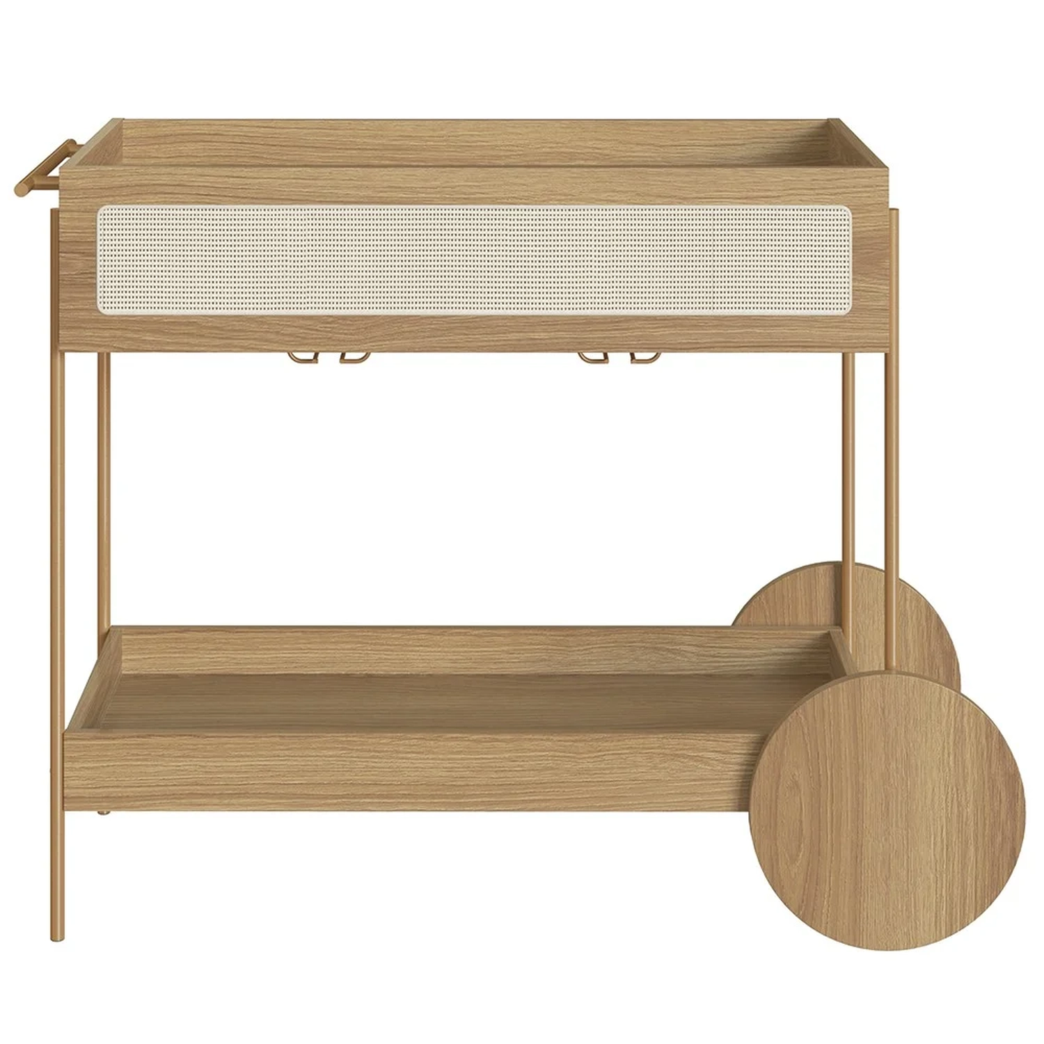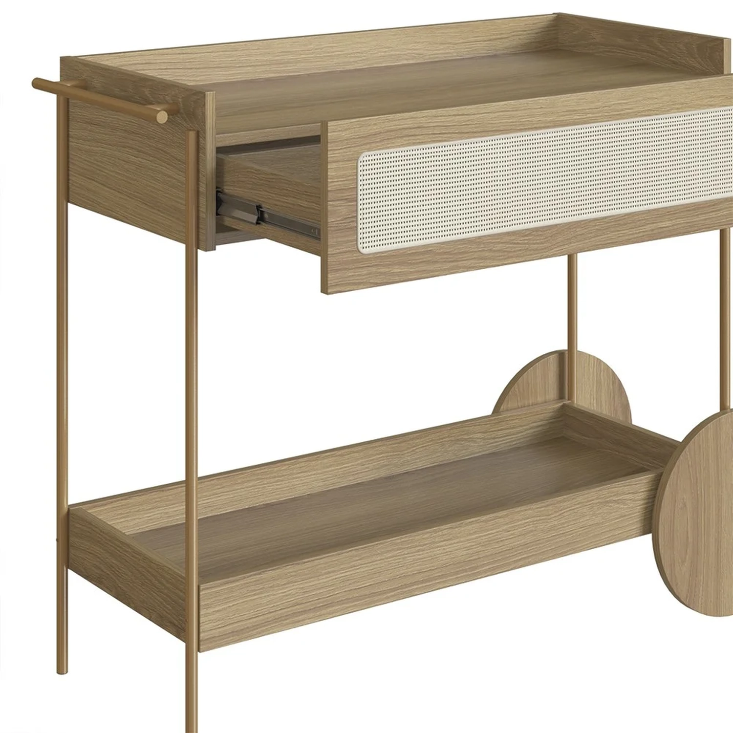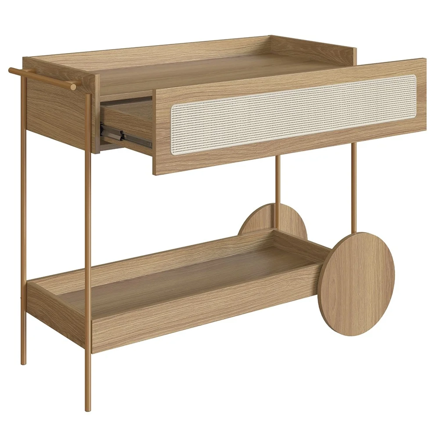Com sua estrutura em MDP de 15mm e acabamento em BP, esse Carrinho Bar promete durabilidade e um visual sofisticado. A gaveta, com corrediças telescópicas e fundo em HDF, garantem um uso suave e eficiente. O detalhe em tela sintética na gaveta adiciona um charme retrô, enquanto os pés em tubo de aço metálico e acabamento em pintura epóxi, com sapatas plásticas, asseguram estabilidade e cuidado com o piso. Embora as rodas sejam apenas decorativas, elas complementam o design, juntamente com o puxador de madeira e o porta taças de aço dourado, conferindo ao Carrinho Auxiliar uma presença marcante em qualquer ambiente.
