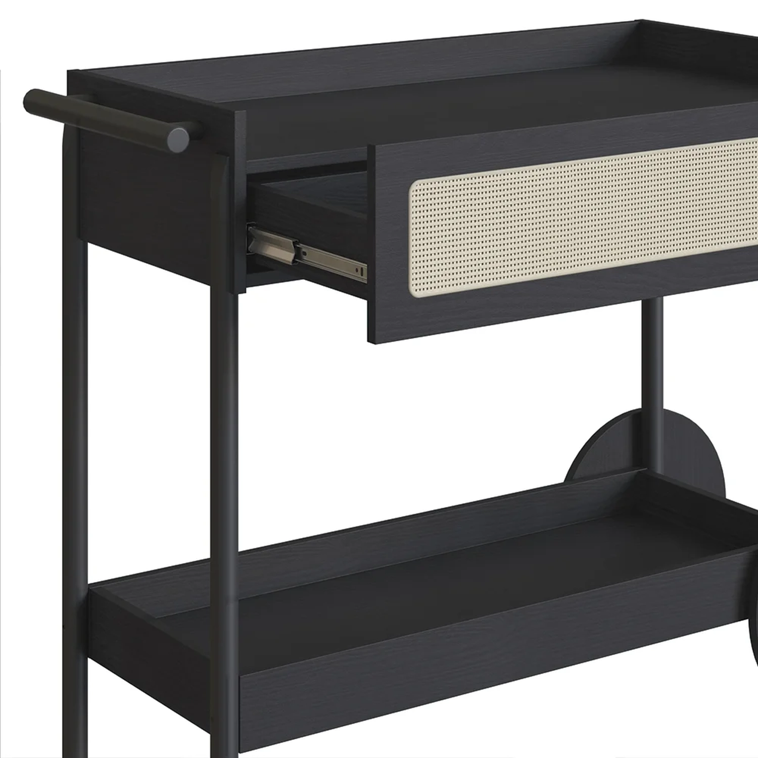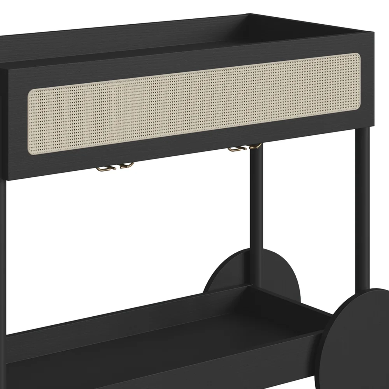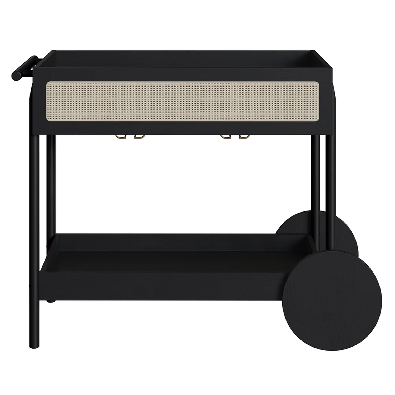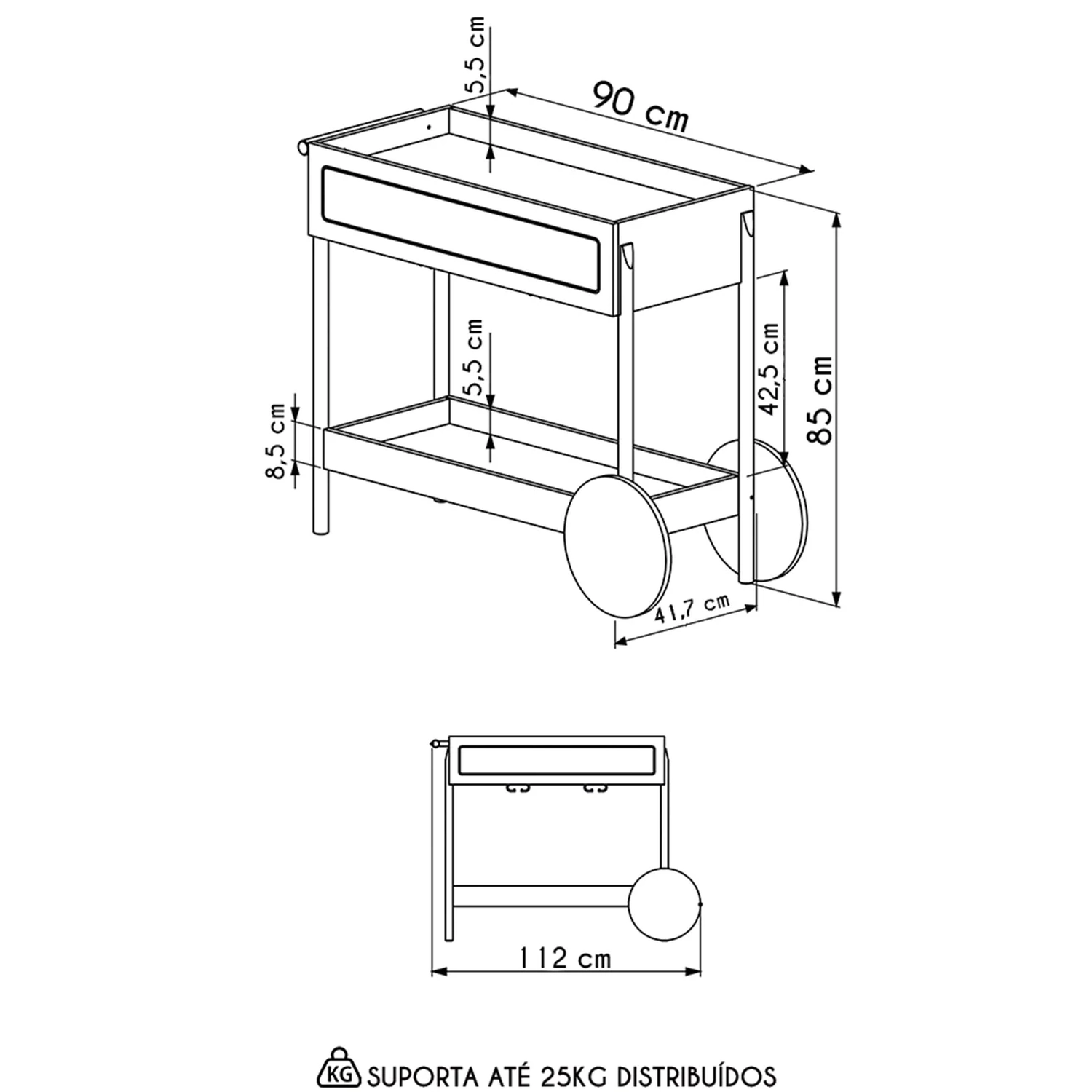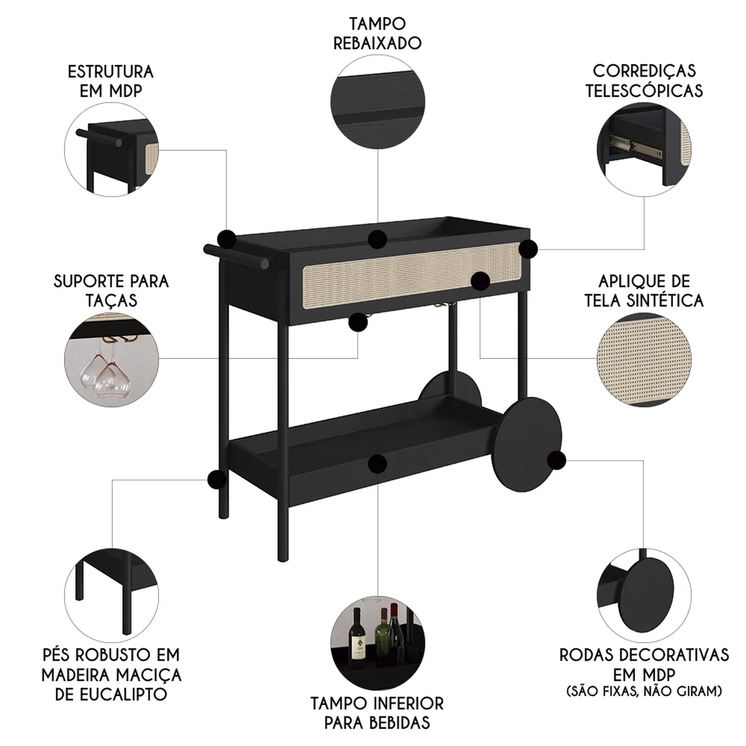 Com sua estrutura em MDP de 15mm e acabamento em BP, esse Carrinho Bar promete durabilidade e um visual sofisticado. A gaveta, com corrediças telescópicas e fundo em HDF, garantem um uso suave e eficiente. O detalhe em tela sintética na gaveta adiciona um charme retrô, enquanto os pés de madeira maciça de eucalipto, com sapatas emborrachadas, asseguram estabilidade e cuidado com o piso. Embora as rodas sejam apenas decorativas, elas complementam o design, juntamente com o puxador de madeira e o porta taças de aço dourado, conferindo ao Carrinho Auxiliar uma presença marcante em qualquer ambiente.