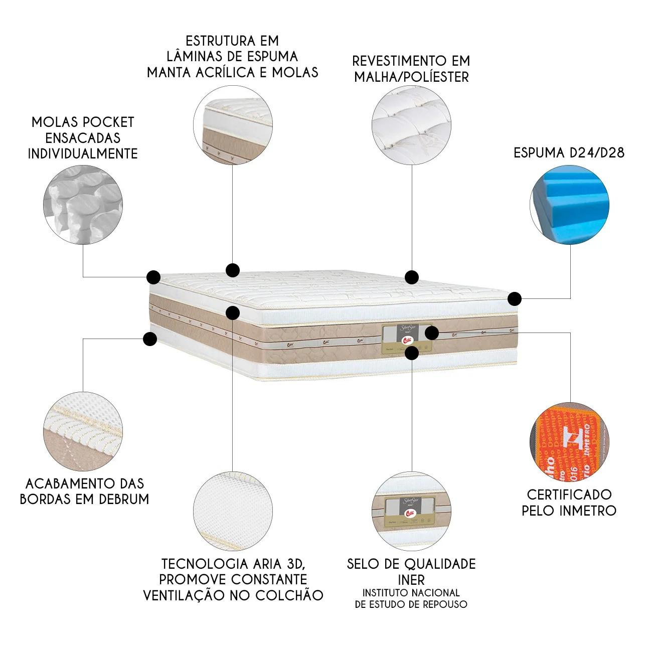 O Colchão de Molas traz uma estrutura interna que conta com molas pocket ensacadas individualmente e bordas em espuma de alta resistência, revestidas em feltro para garantir estabilidade. O enchimento interno inclui lâminas de espumas D28, proporcionando um suporte confortável e balanceado. O tecido das laterais é 100% poliéster com bordado zig-zag, enquanto a faixa lateral com aria 3D promove ventilação constante para o colchão. No tampão superior, a malha de poliéster conta com uma camada de espuma D24 hiper macia, e seu acabamento em debrum reforça a durabilidade e elegância do produto. Já com pillow top dupla face e tecido em poliéster.