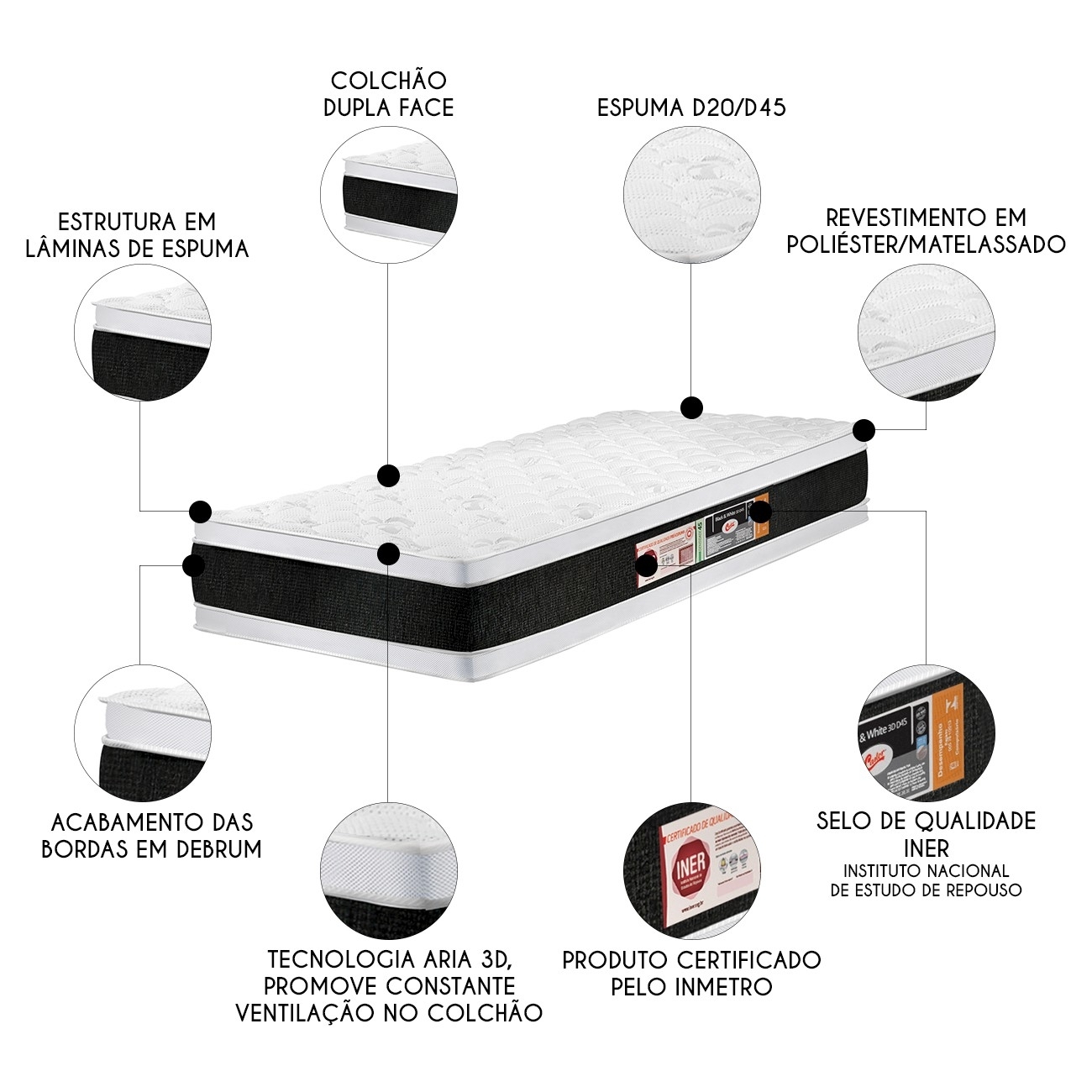 Esse Colchão oferece a mais alta qualidade em cada detalhe, com dupla face para prolongar sua durabilidade e permitir a escolha entre dois lados de uso. Sua estrutura interna, composta por Lâminas de espuma D45, foi projetada para oferecer o suporte perfeito, enquanto a faixa lateral, equipada com a tecnologia Aria 3D, proporciona uma circulação de ar otimizada, criando um ambiente de sono fresco e agradável. O tampo superior, em poliéster, conta com duas camadas de espuma de poliuretano, garantindo um toque extra de conforto. O acabamento refinado, com bordado contínuo e debrum, reforça as bordas laterais, conferindo um visual elegante ao Quarto de Solteiro. O tampo inferior em poliéster liso complementa o conjunto com sofisticação.