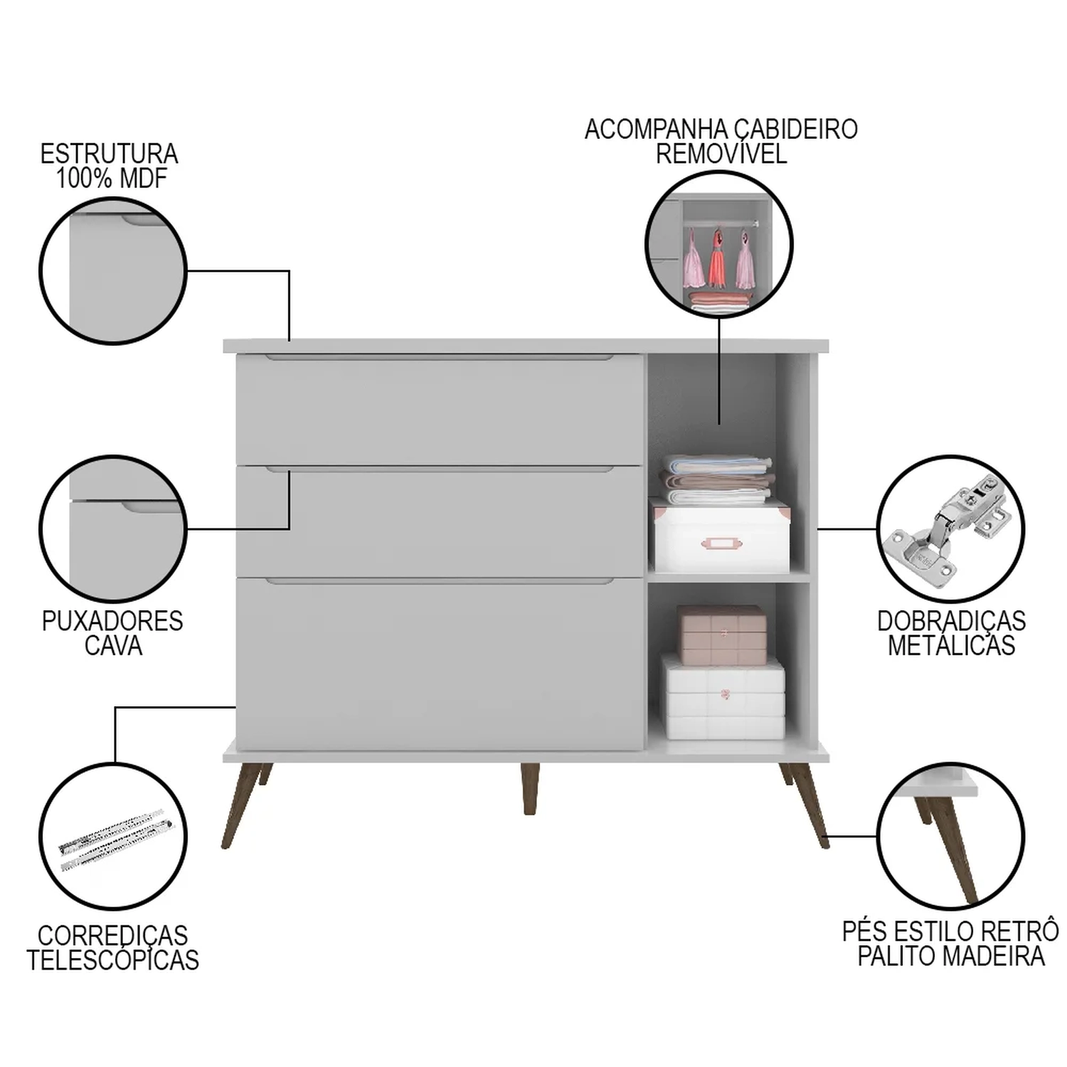 Com a Cômoda Infantil Melinda Cinza, da Phoenix Baby, você tem a garantia de estar adquirindo um produto de qualidade, pois é fabricada 100% em MDF de 15mm, ou seja, muito resistente e duradoura. Além disso, é funcional, já que é composta por 3 gavetas e 1 porta que oferecem um amplo espaço para deixar tudo organizado e no lugar. Ah, e os pés palito estilo retrô são um charme a parte e criam um ar vintage ao passo que o design com linhas retas e puxadores modelo cava agregam modernidade.