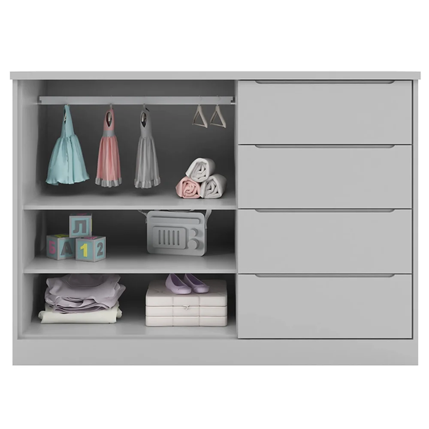 Além da beleza, essa Cômoda Para Quarto Infantil é super funcional, pois conta com 4 gavetas com corrediças telescópicas que deslizam suavemente, 2 portas e 2 prateleiras internas para você guardar as roupinhas, toalhas, lenços e fraldas. Perfeita para compor o quarto de bebê!