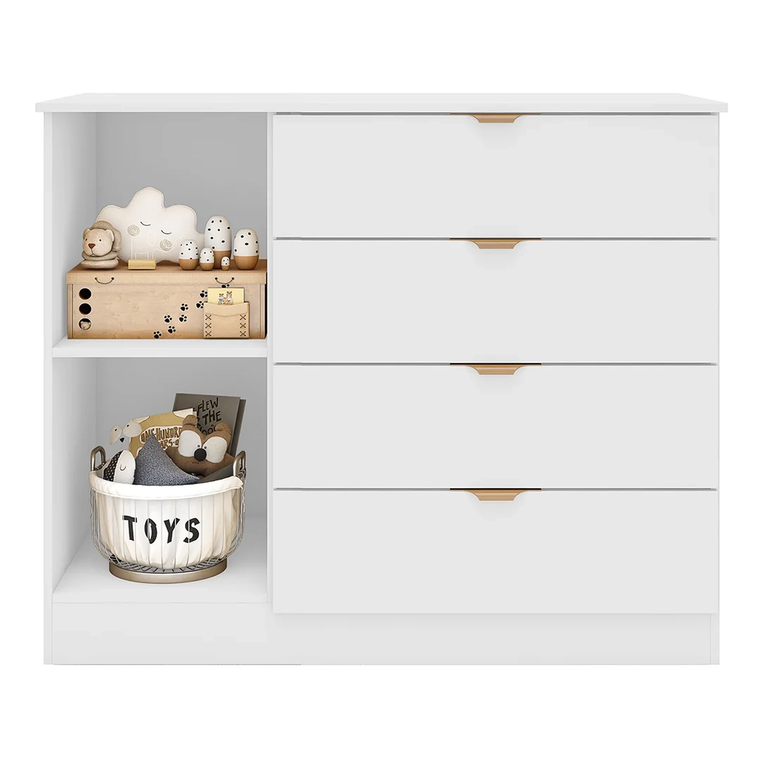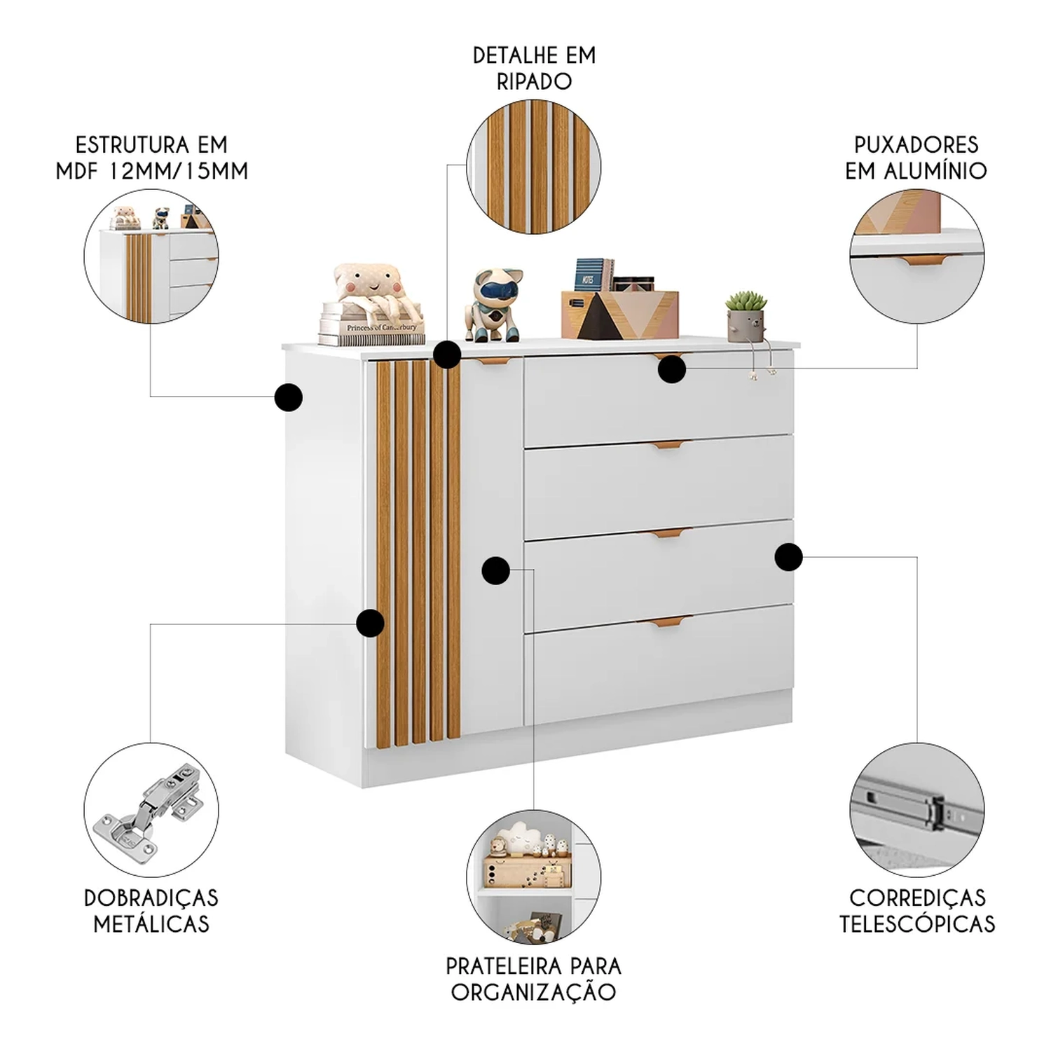 Com uma estrutura robusta em MDF e acabamento em pintura UV, este móvel oferece durabilidade e resistência ao uso diário. As 4 gavetas com corrediças telescópicas proporcionam um deslizamento suave, facilitando o acesso aos itens armazenados. A porta com dobradiças metálicas e os puxadores de alumínio na cor cobre conferem um toque de elegância e sofisticação ao produto. A presença de uma prateleira interna permite uma organização eficiente dos acessórios das crianças, tornando a Cômoda Ripada uma escolha versátil que se adapta a diferentes estilos de decoração e necessidades do Quarto infantil. Sua funcionalidade e estética são projetadas para complementar o espaço, criando um ambiente harmonioso e propício para o desenvolvimento dos pequenos.