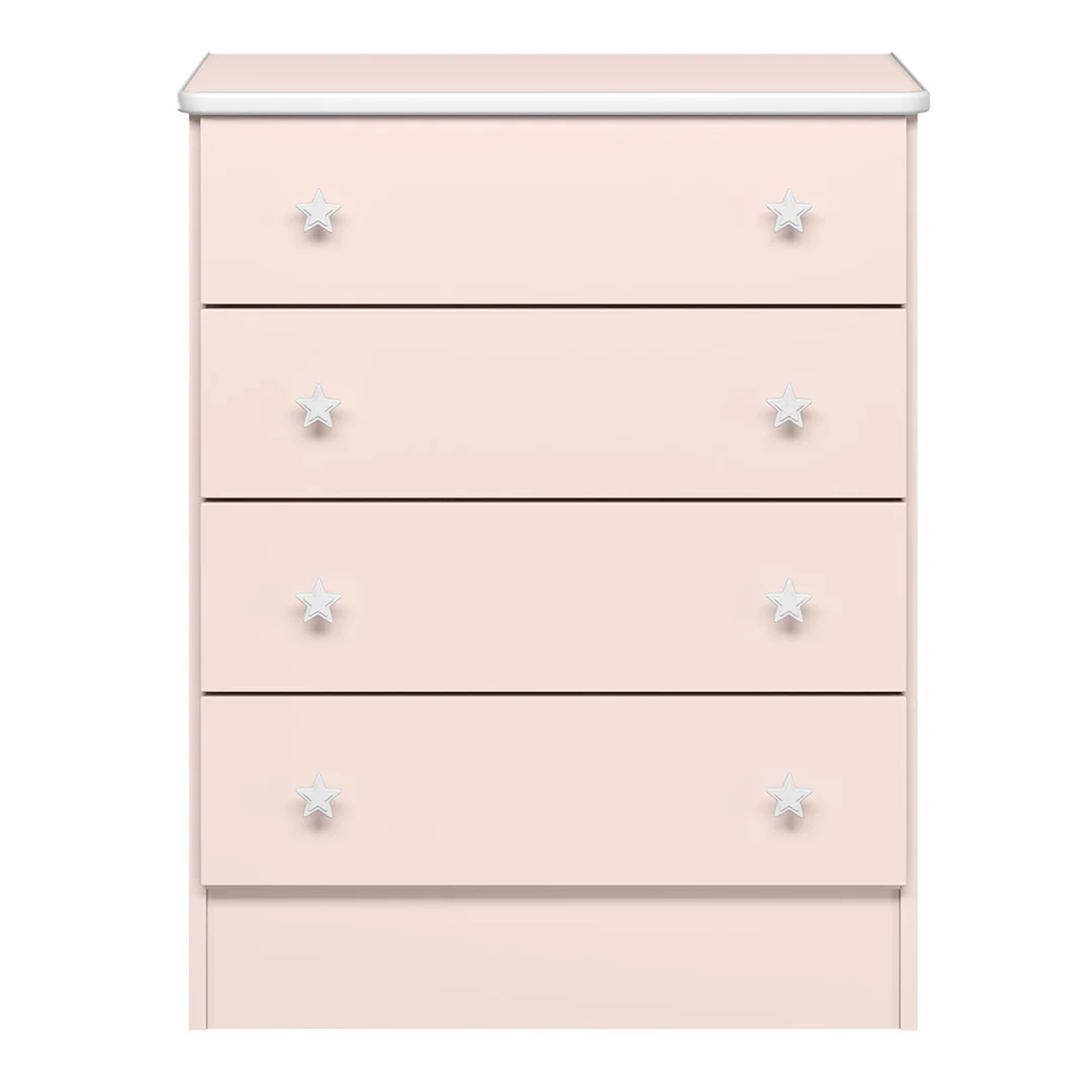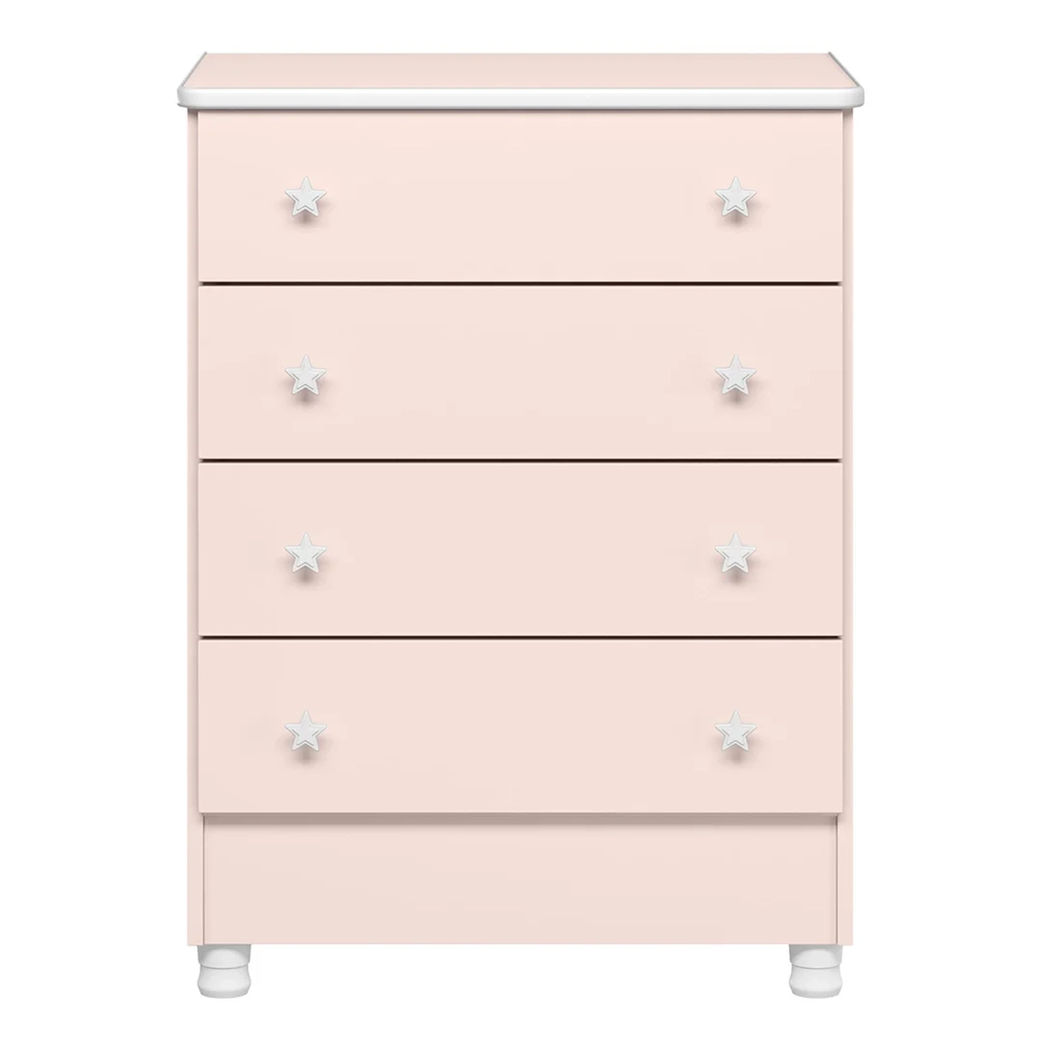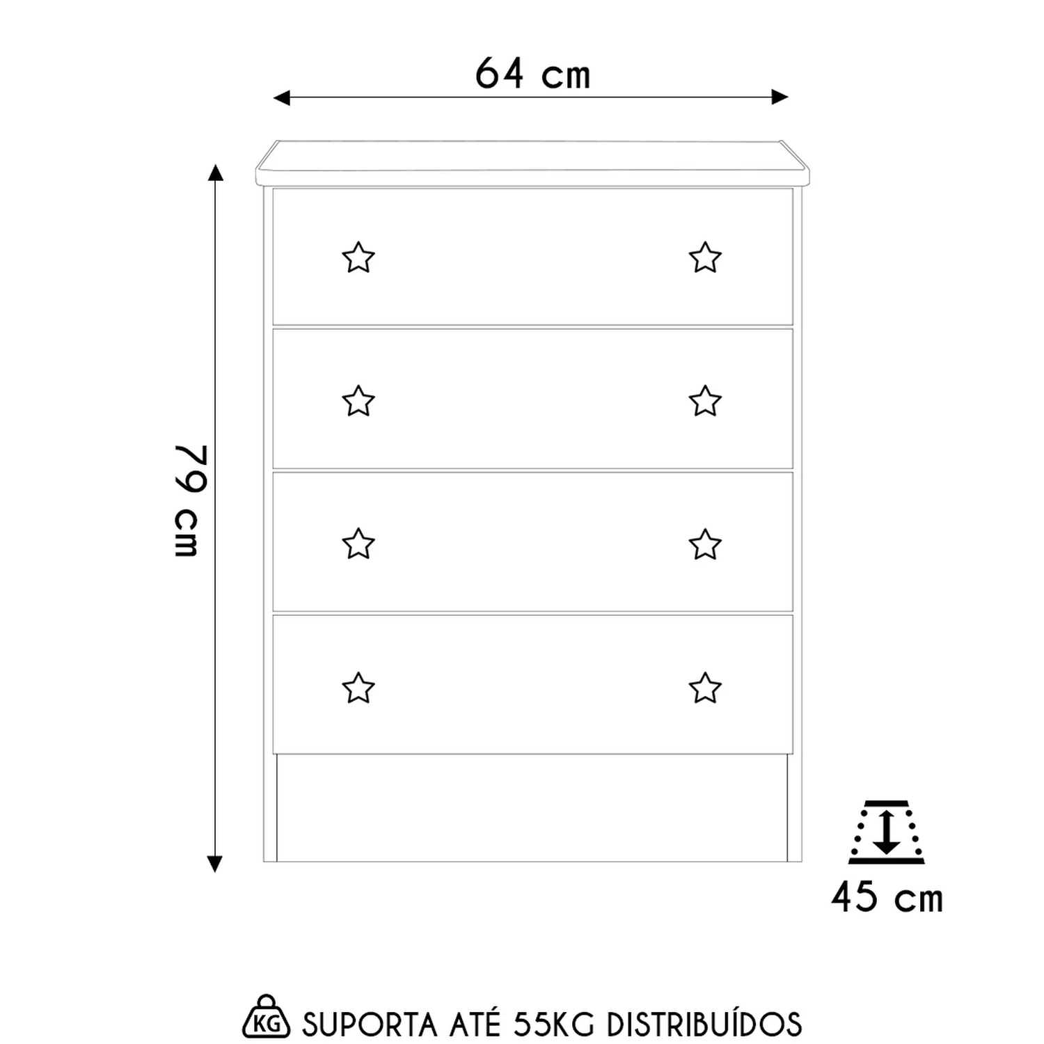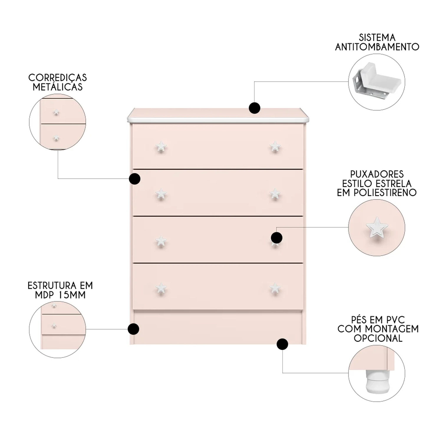 A Cômoda 4 Gavetas tem uma excelente profundidade, para ainda mais organização no quarto do bebê. As gavetas são equipadas com corrediças metálicas para um deslizar suave. Os pés opcionais em PVC oferecem uma base elevada e estável, evitando o contato direto com o chão, enquanto os puxadores duplos de plástico poliestireno, com formato de estrela proporcionam um toque encantador ao móvel. O acabamento de alta qualidade, revestido em pintura UV, realça a cor escolhida, trazendo um toque vibrante e elegante ao ambiente. Além disso, a cômoda possui sistema antitombamento, oferecendo segurança adicional. Essa Cômoda Infantil é ideal para quem busca harmonizar funcionalidade e estilo na decoração, criando um ambiente organizado e aconchegante para todas as demandas diárias.