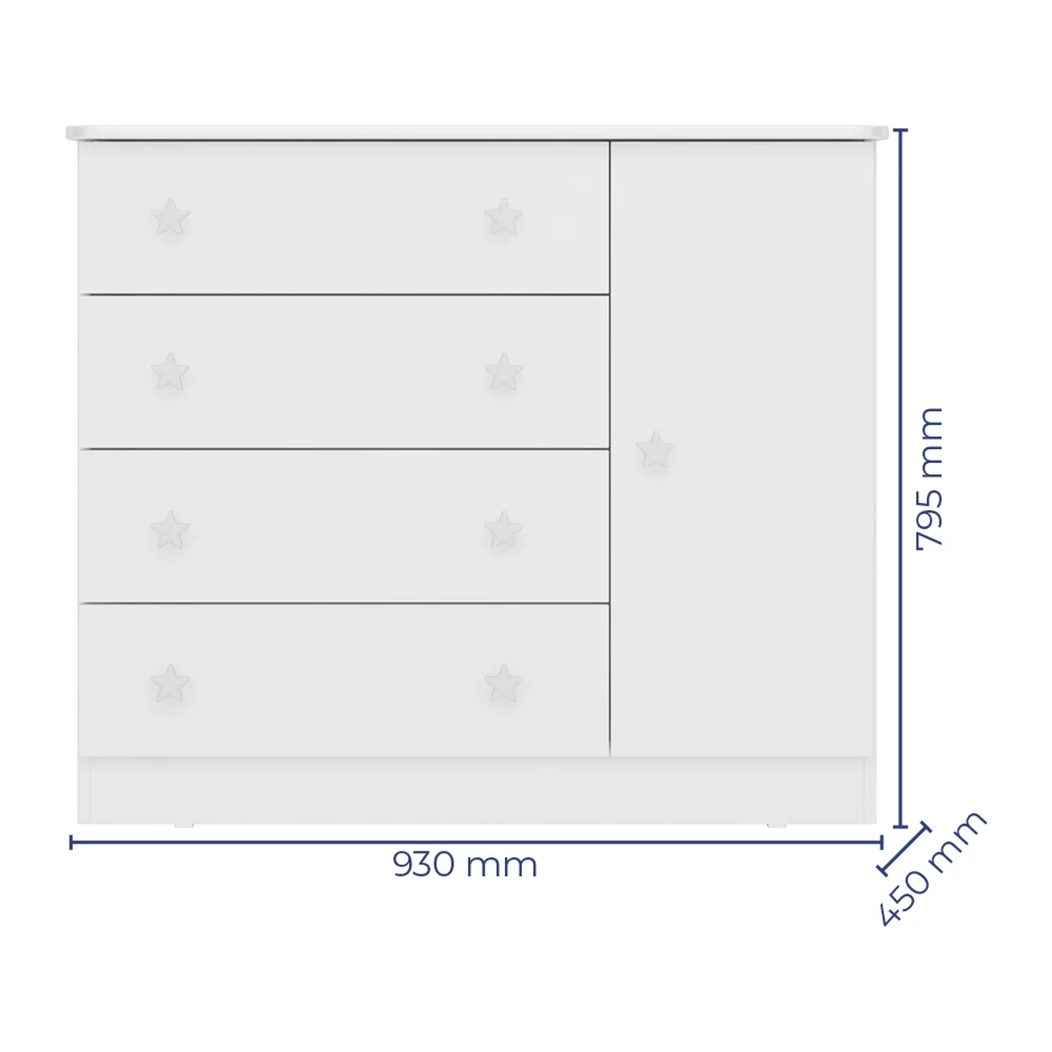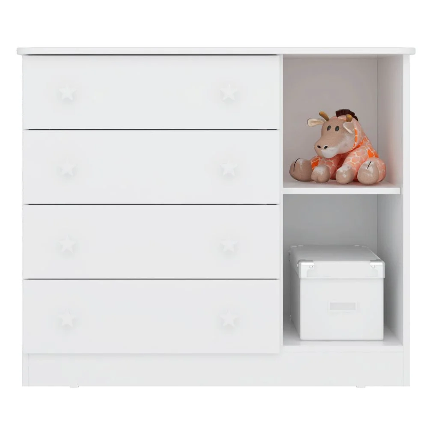 Cômoda Infantil Doce Sonho 1 Porta 4 Gavetas Branco, estrutura reforçada confeccionada em MDP de qualidade com acabamento em pintura UV que proporciona maior durabilidade e resistência ao produto, design exclusivo para deixar o quarto do seu bebê mais bonito. Possui 1 porta com prateleira interna, 4 gavetas com excelente profundidade e puxadores exclusivos em formato de estrela. Confira e garanta já a sua!