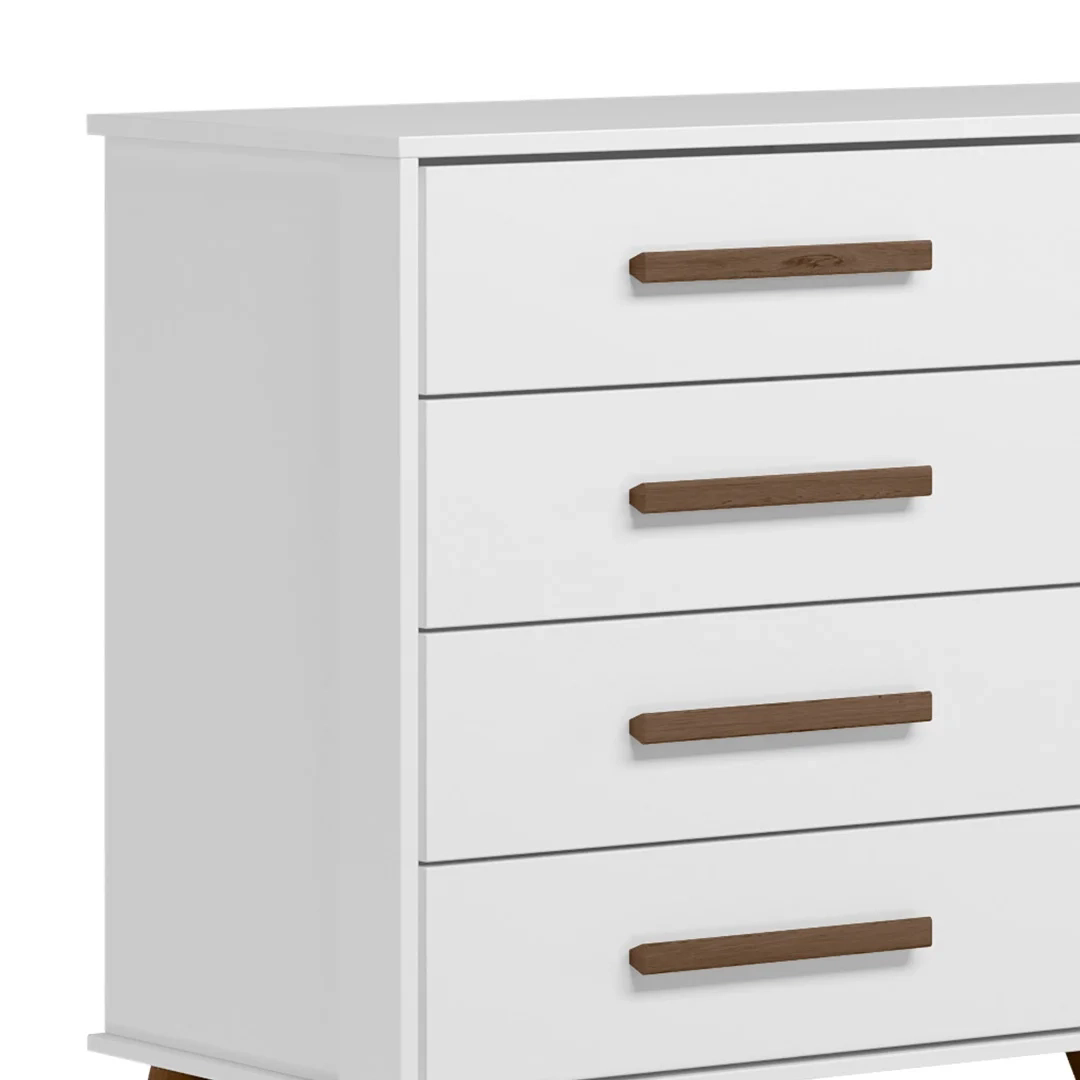 A Cômoda Retrô possui quatro gavetas com excelente profundidade e uma porta convencional com corrediças metálicas, que pode ser usada também como sapateira, para ainda mais organização para itens de vestuário e demais objetos. As gavetas são equipadas com corrediças metálicas para um deslizar suave. Os pés torneados em madeira de eucalipto com design retrô, enquanto os puxadores de em MDF, com alto padrão de acabamento, complementam o design sofisticado. O excelente acabamento revestido em pintura UV destaca ainda mais a cor escolhida, proporcionando um visual vibrante ao ambiente. Além disso, a cômoda possui sistema antitombamento, oferecendo segurança adicional para uso diário. Essa Cômoda Sapateira Infantil é para aqueles que buscam unir funcionalidade e estilo na decoração, criando um ambiente agradável e bem organizado para atender a todas as necessidades diárias.