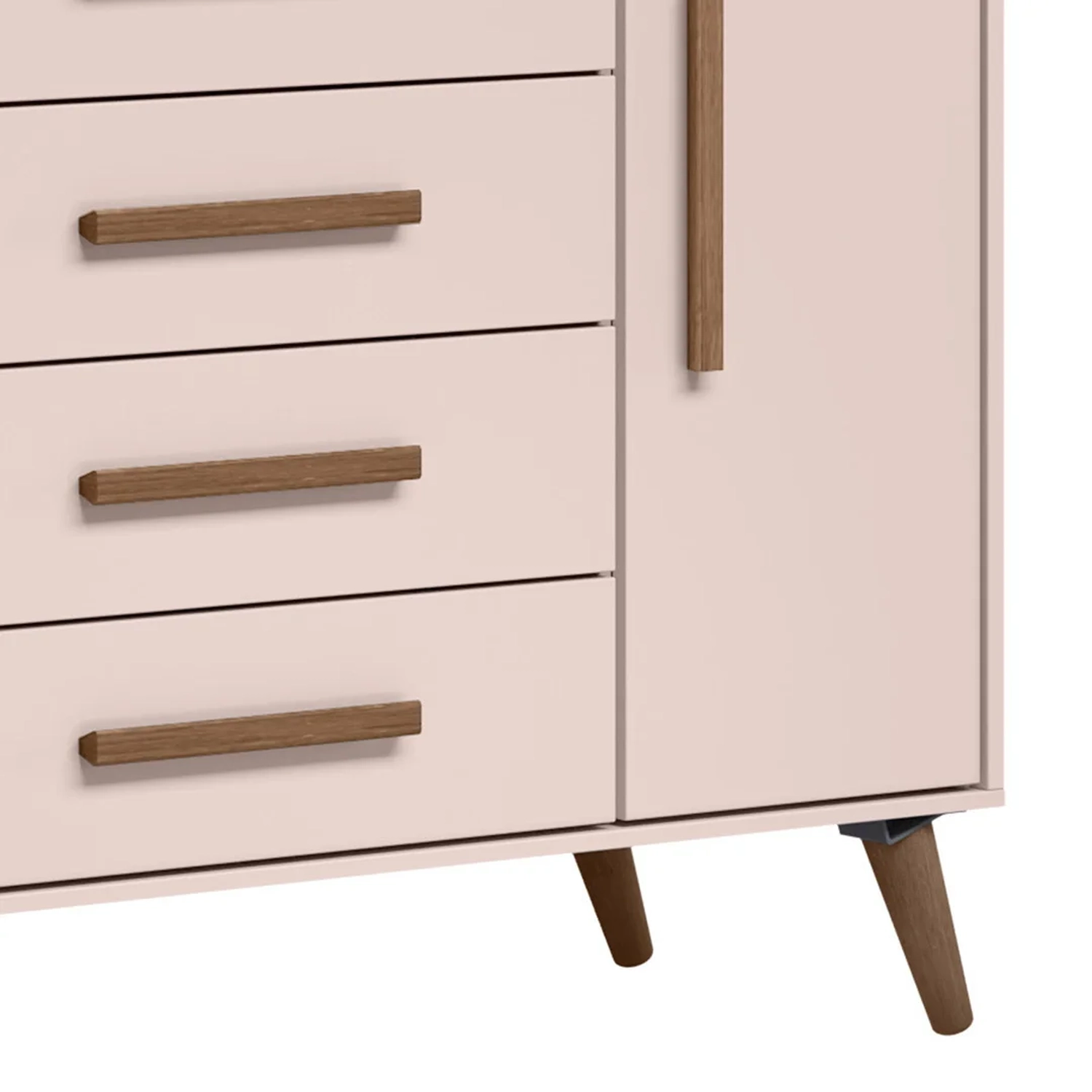 A Cômoda Retrô possui quatro gavetas com excelente profundidade e uma porta convencional com corrediças metálicas, que pode ser usada também como sapateira, para ainda mais organização para itens de vestuário e demais objetos. As gavetas são equipadas com corrediças metálicas para um deslizar suave. Os pés torneados em madeira de eucalipto com design retrô, enquanto os puxadores de em MDF, com alto padrão de acabamento, complementam o design sofisticado. O excelente acabamento revestido em pintura UV destaca ainda mais a cor escolhida, proporcionando um visual vibrante ao ambiente. Além disso, a cômoda possui sistema antitombamento, oferecendo segurança adicional para uso diário. Essa Cômoda Sapateira Infantil é para aqueles que buscam unir funcionalidade e estilo na decoração, criando um ambiente agradável e bem organizado para atender a todas as necessidades diárias.
