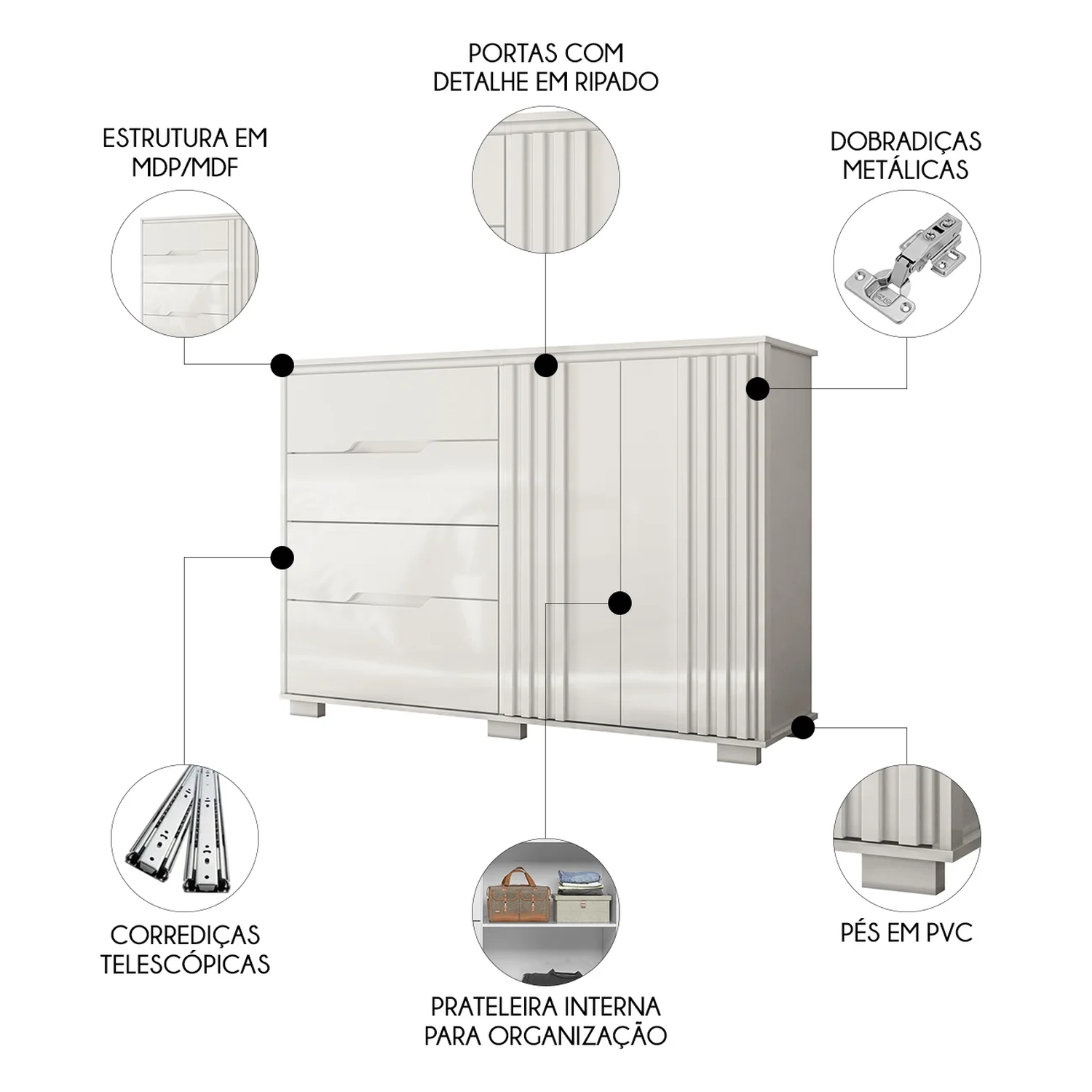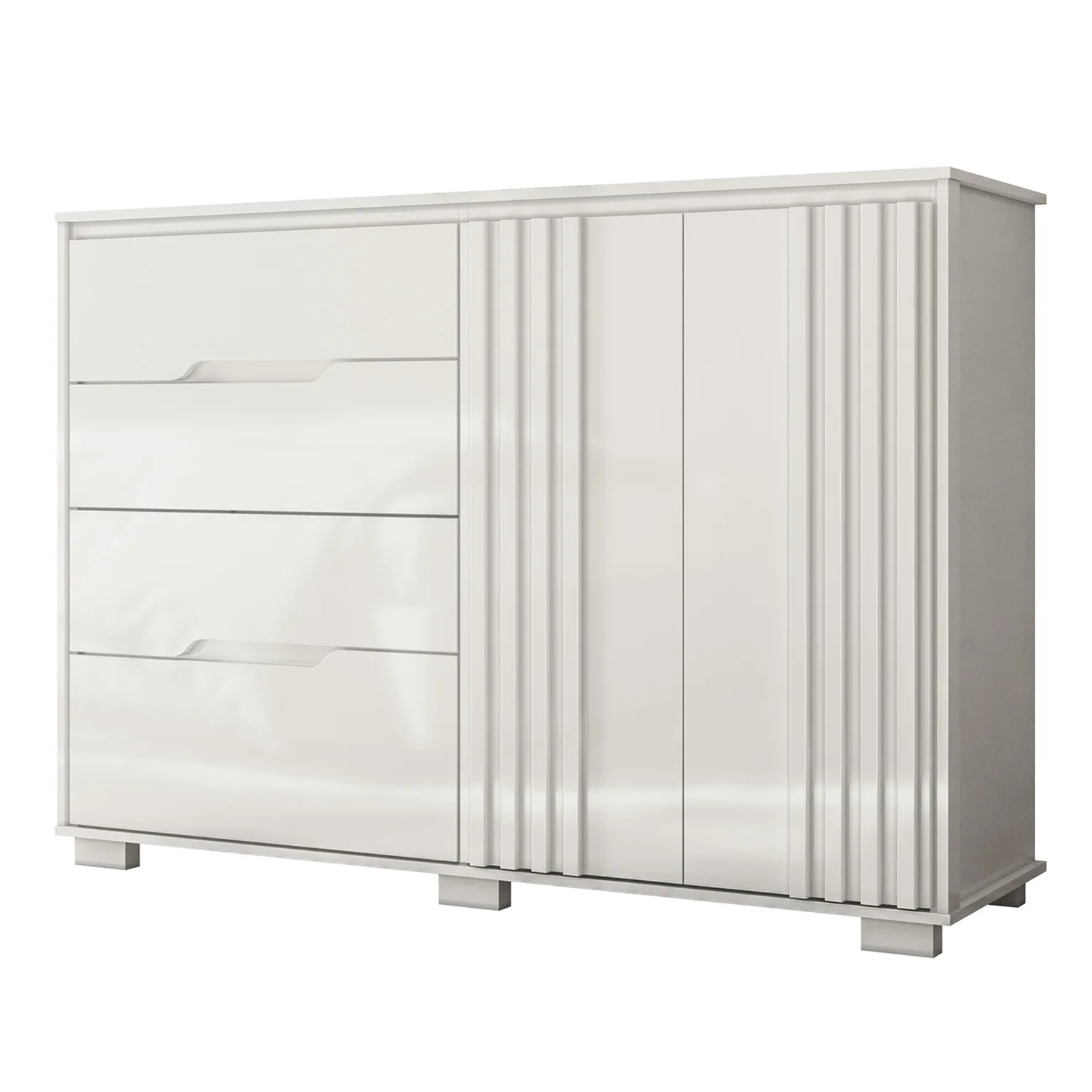Perfeita para o seu Quarto, esta Cômoda combina estilo e funcionalidade. Dispondo de quatro gavetas com corrediças telescópicas, duas portas com dobradiças metálicas e amortecedor e uma prateleira interna, ela oferece amplo espaço para organizar roupas, acessórios e objetos pessoais, sendo possível também acomodar itens sobre o tampo, complementando a decoração do seu espaço com mais personalidade. O design das gavetas com cava, que dispensa o uso de puxadores, somado ao detalhe ripado das portas adiciona sofisticação ao móvel, tornando-o um ponto de destaque tanto no Quarto do Casal quanto no Quarto de Solteiro. Fabricada em MDP/MDF de 12 e 15mm com acabamento em pintura UV de alta qualidade, ela garante resistência e durabilidade por muito mais tempo aliando praticidade e beleza em um único produto.
