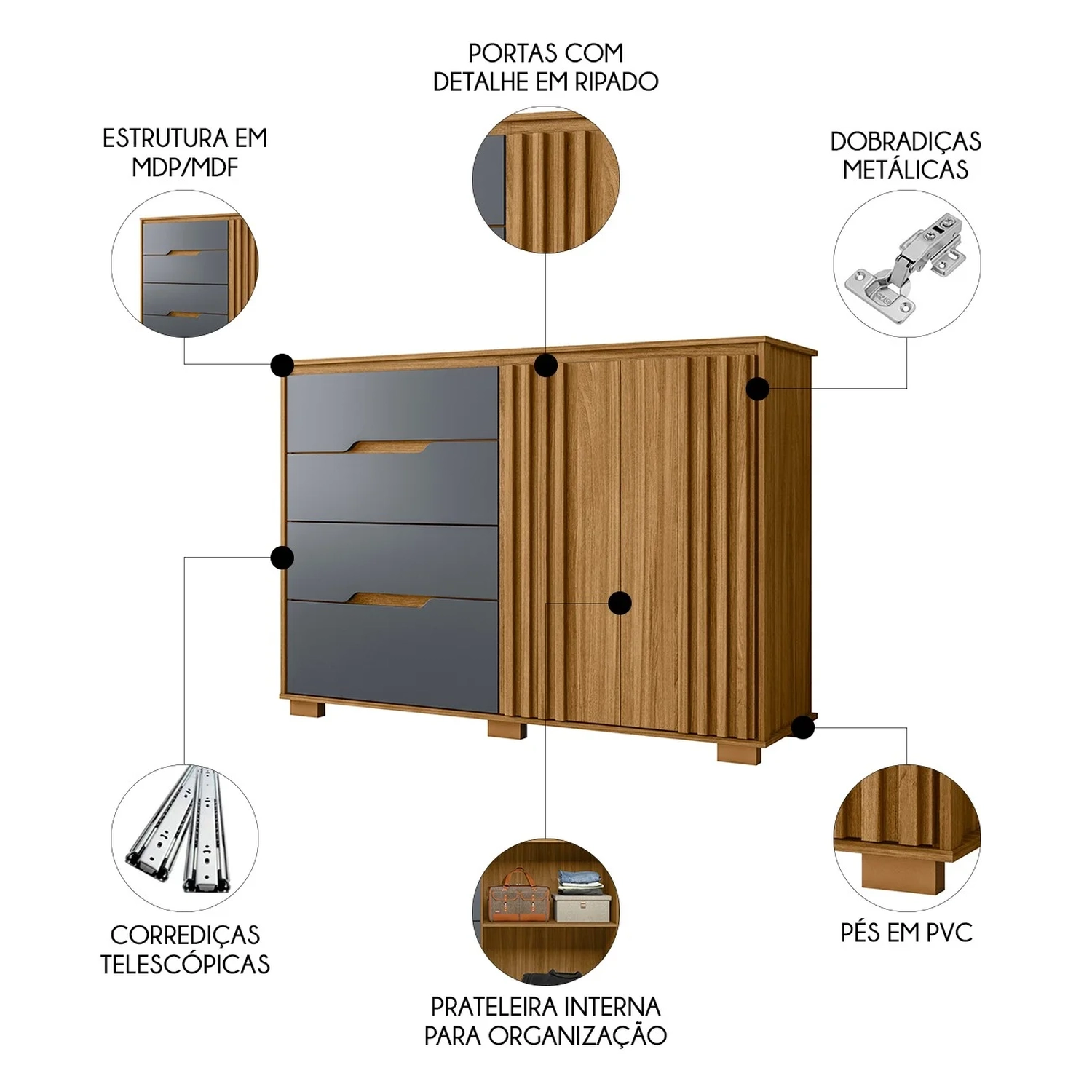 Perfeita para o seu Quarto, esta Cômoda combina estilo e funcionalidade. Dispondo de quatro gavetas com corrediças telescópicas, duas portas com dobradiças metálicas e amortecedor e uma prateleira interna, ela oferece amplo espaço para organizar roupas, acessórios e objetos pessoais, sendo possível também acomodar itens sobre o tampo, complementando a decoração do seu espaço com mais personalidade. O design das gavetas com cava, que dispensa o uso de puxadores, somado ao detalhe ripado das portas adiciona sofisticação ao móvel, tornando-o um ponto de destaque tanto no Quarto do Casal quanto no Quarto de Solteiro. Fabricada em MDP/MDF de 12 e 15mm com acabamento em pintura UV de alta qualidade, ela garante resistência e durabilidade por muito mais tempo aliando praticidade e beleza em um único produto.