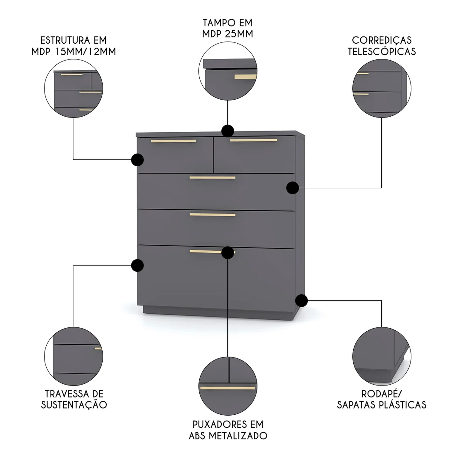 Quantidade de Gavetas: 5 Gavetas.