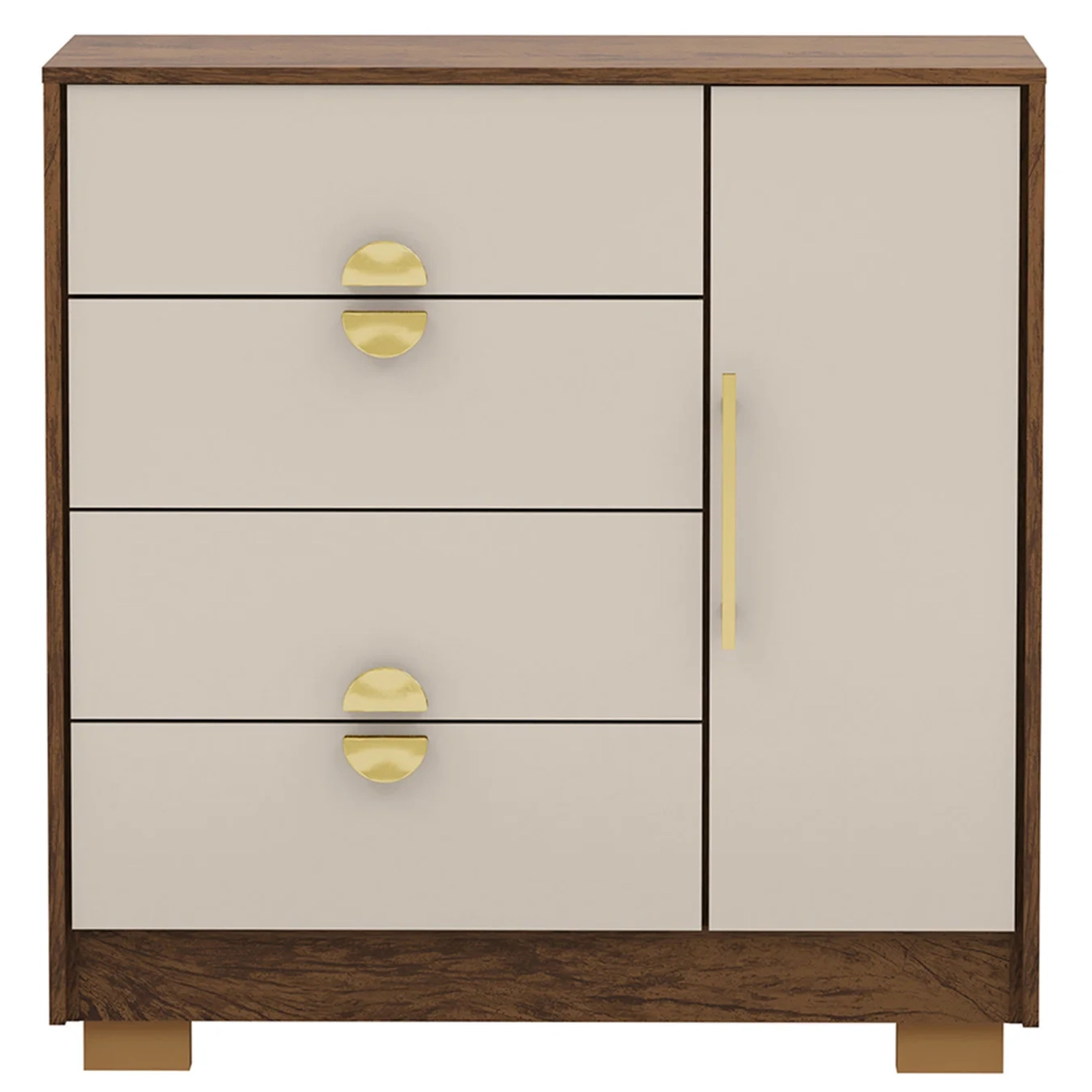 Os pés opcionais na montagem e a moldura lateral proporcionam robustez e um acabamento refinado, destacando ainda mais a beleza do móvel. Esses detalhes de design tornam a Cômoda 4 Gavetas uma peça versátil que se adapta às suas necessidades, agregando valor ao seu ambiente.