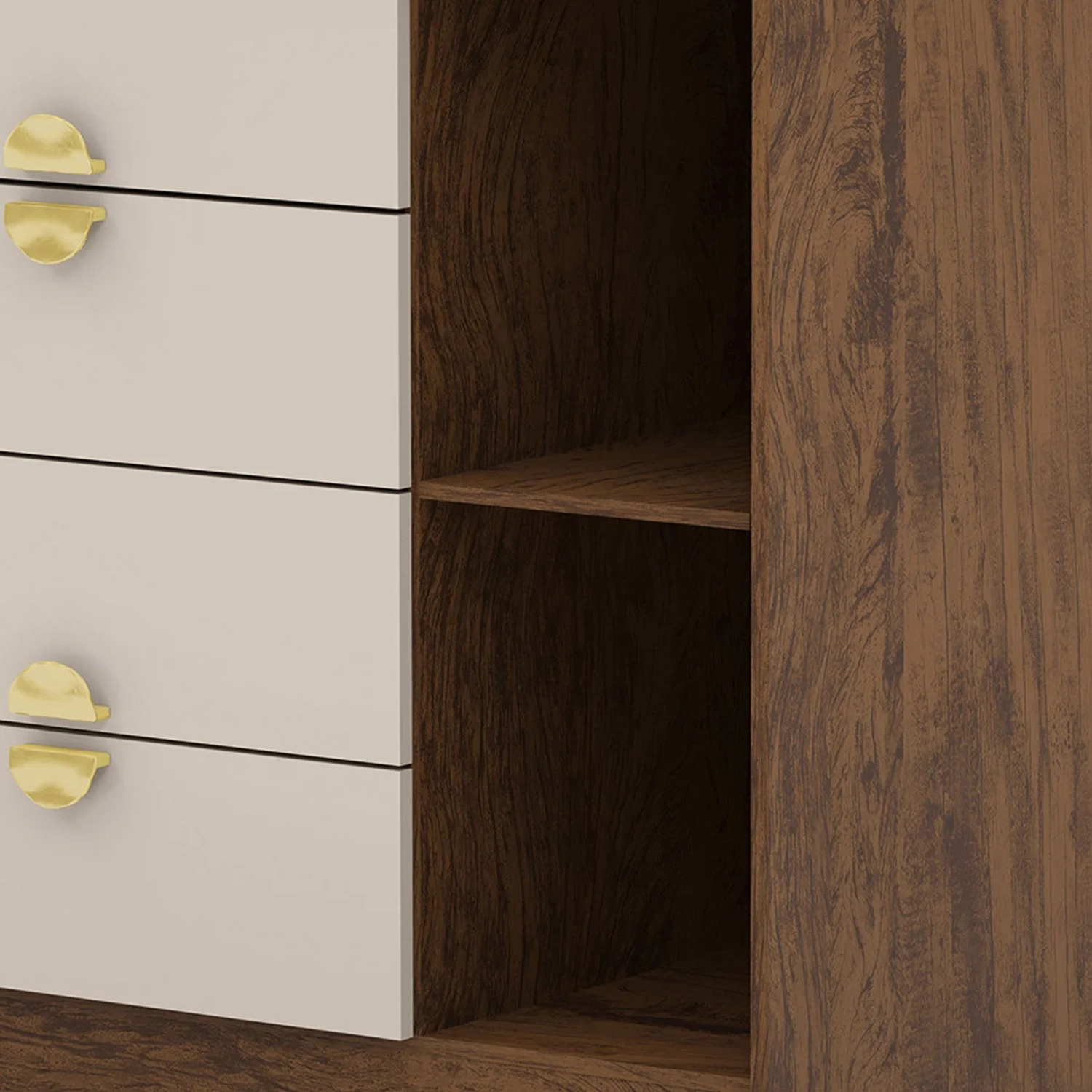Com quatro gavetas equipadas com corrediças metálicas e uma porta lateral com prateleira móvel, a Cômoda Para Quarto oferece versatilidade e praticidade. Ela permite uma organização eficiente de diversos itens, mantendo o ambiente sempre arrumado e acessível. A estrutura foi projetada para garantir funcionalidade sem abrir mão do estilo.