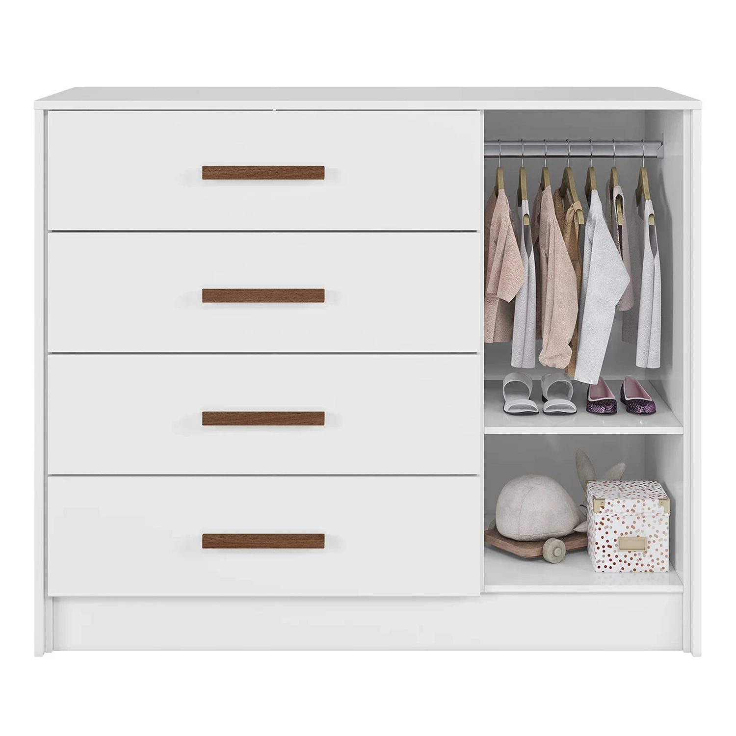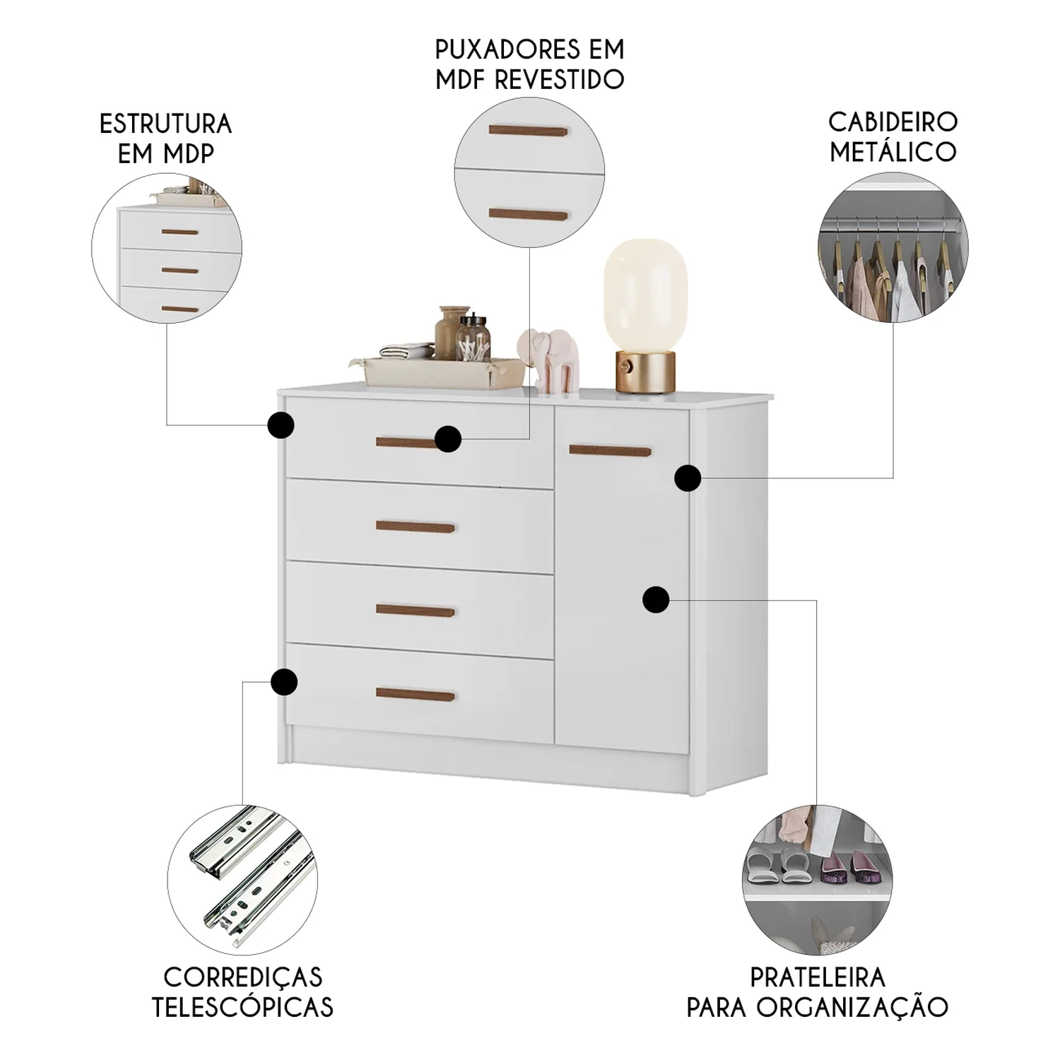 A Cômoda conta com uma porta lateral com prateleira interna, ideal para armazenar objetos maiores como mantas, brinquedos ou produtos de higiene, e também cabideiro para pendurar pequenas peças.