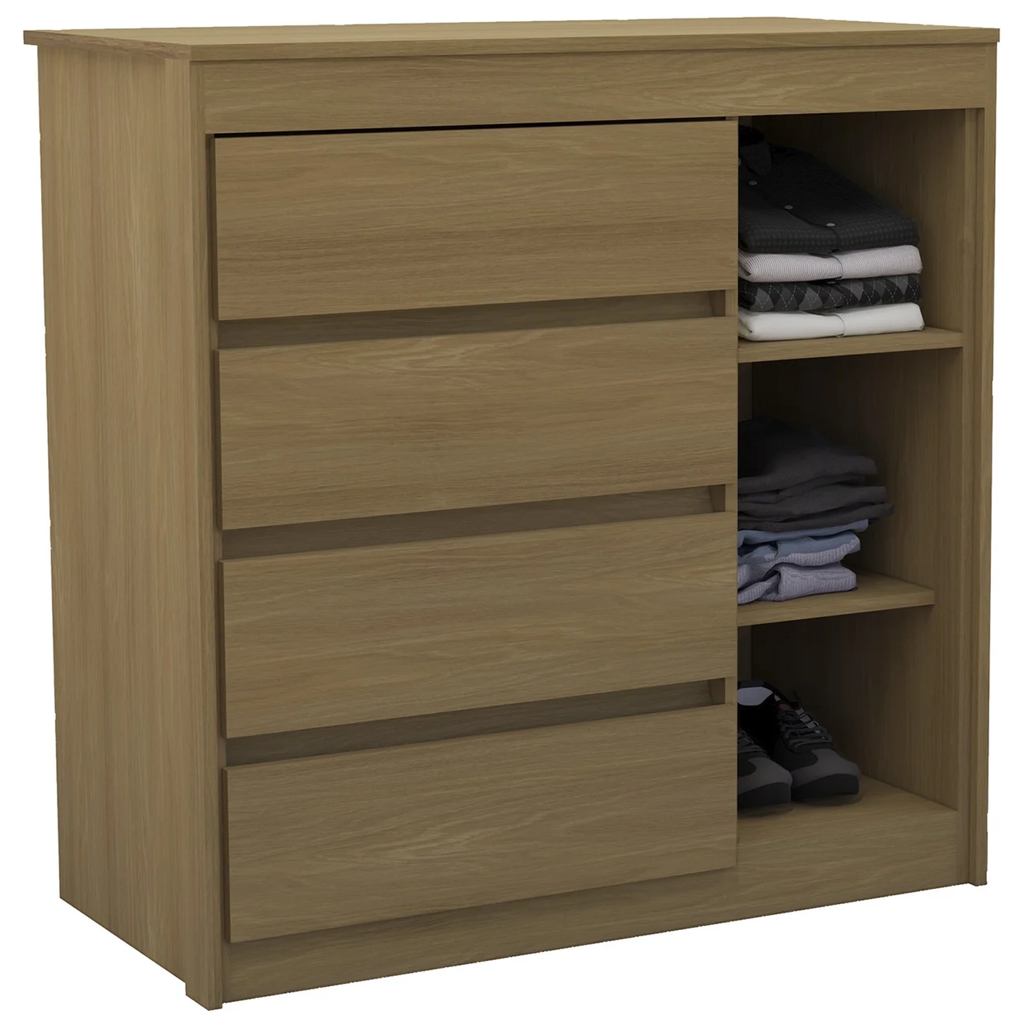 Além das quatro gavetas com corrediças telescópicas, essa Cômoda Para Casal conta com uma porta lateral que esconde duas prateleiras internas ideais para organizar roupas, toalhas ou objetos maiores.