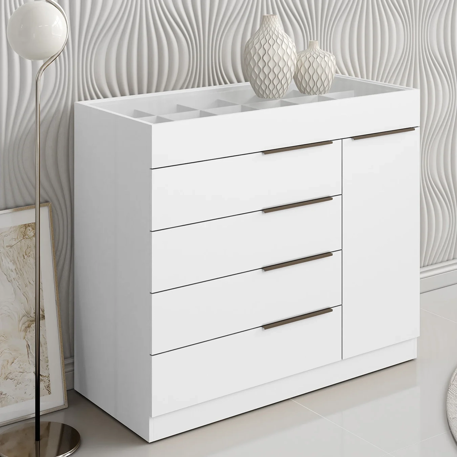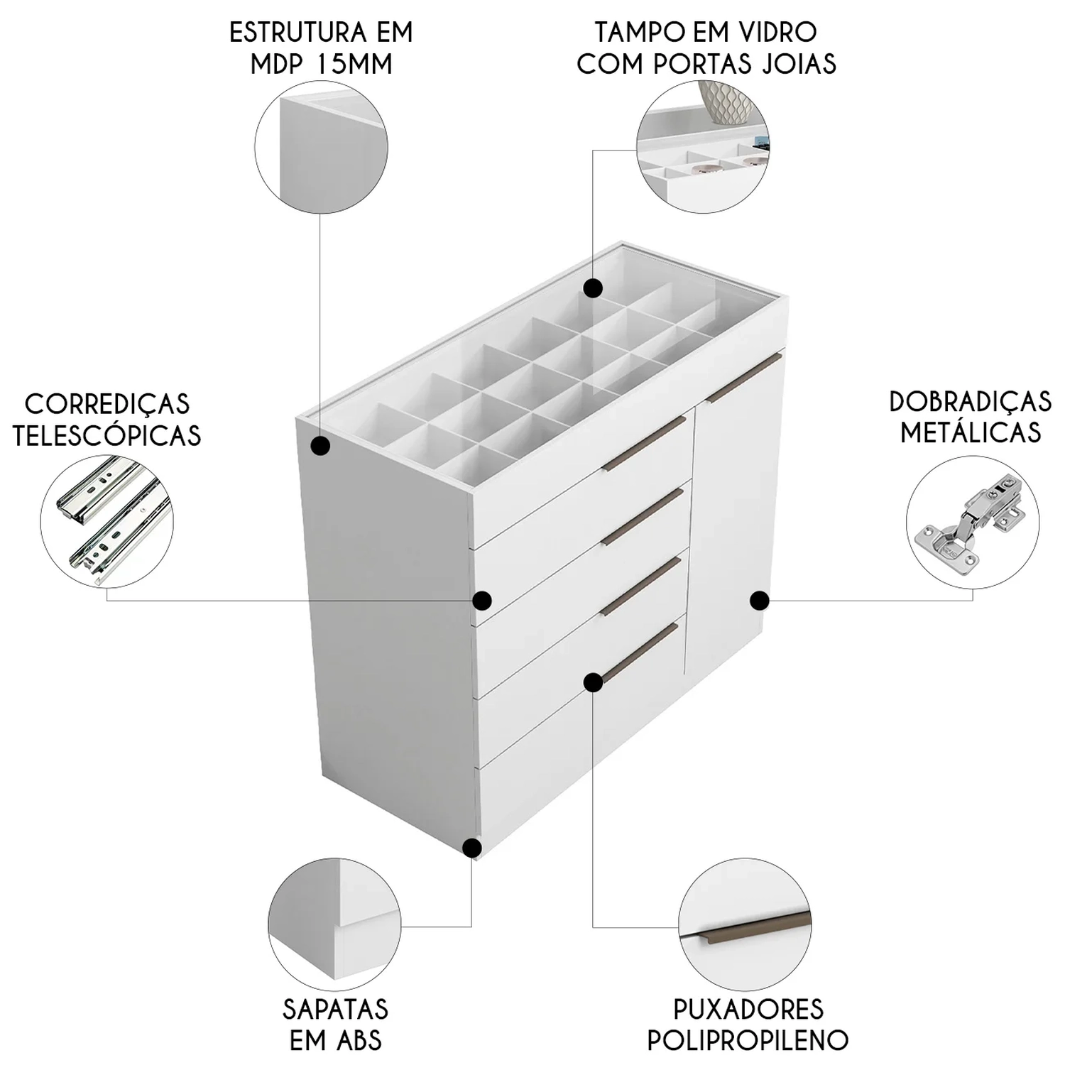 O tampo desta Cômoda Moderna traz um porta-joias com mostrador em vidro, perfeito para visualizar seus acessórios ou maquiagens. A abertura tipo gaveta garante praticidade para ter acesso facil ao seus itens preferidos.